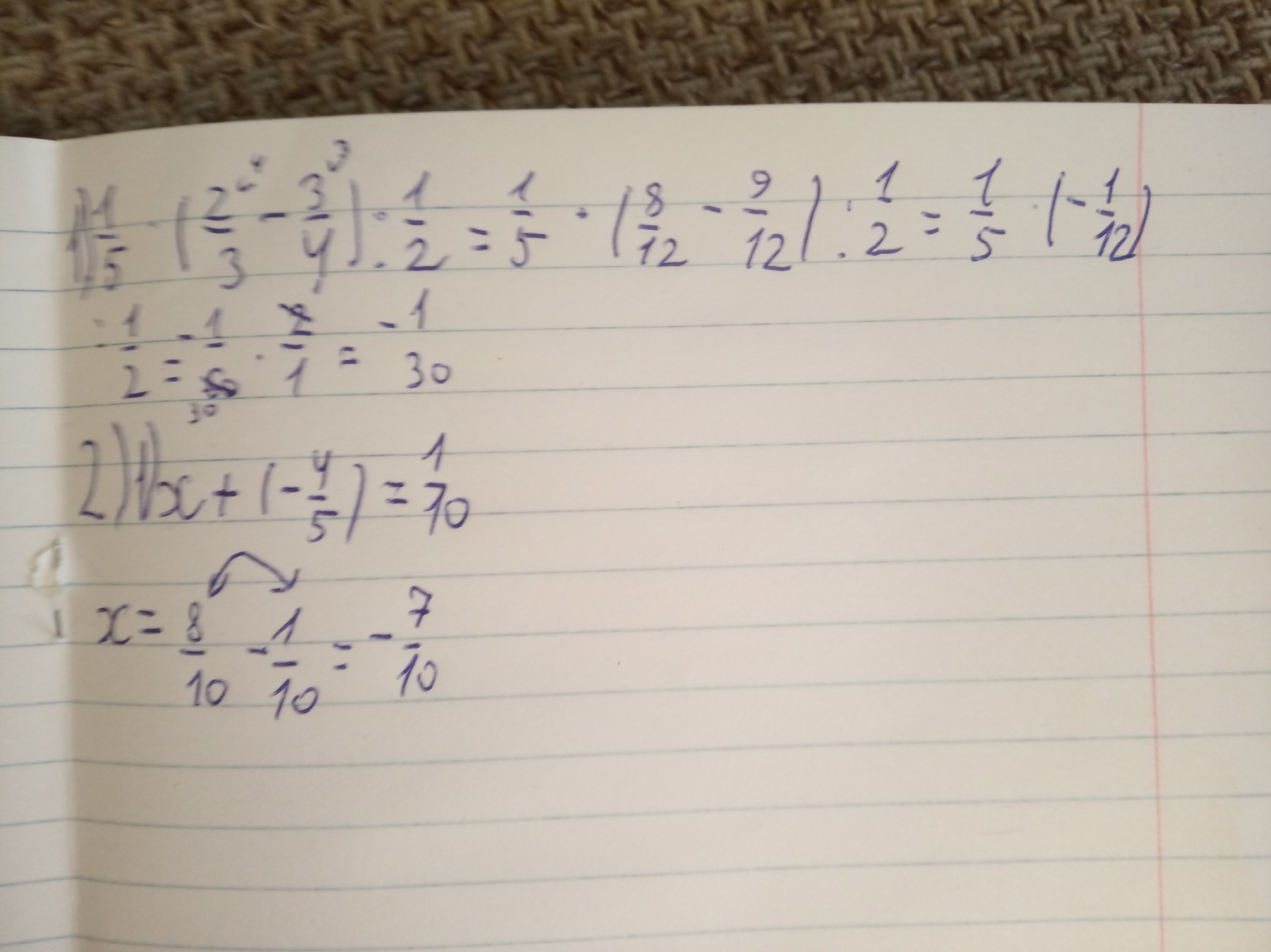 2) 1/5+(2/3-3/4) ÷1/2= 1/5×(-1/12)÷1/2= -1/5×1/12×2= -1/5×1/6=-1/30