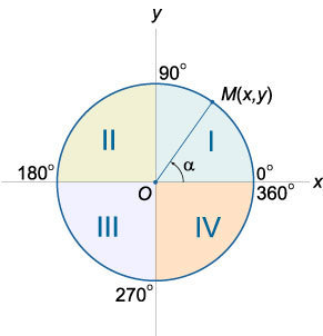 Отсчёт положительных значений угла идёт против часовой стрелке => 72°<90° - это первая четверть окружности.