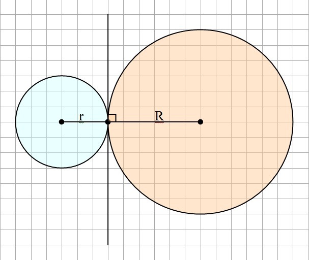 Так как касательная, проходящая через точку касания окружностей, перпендикулярна диаметрам этих окружностей, то точка касания окружностей лежит на отрезке, состоящем из их радиусов. (См. рис.)