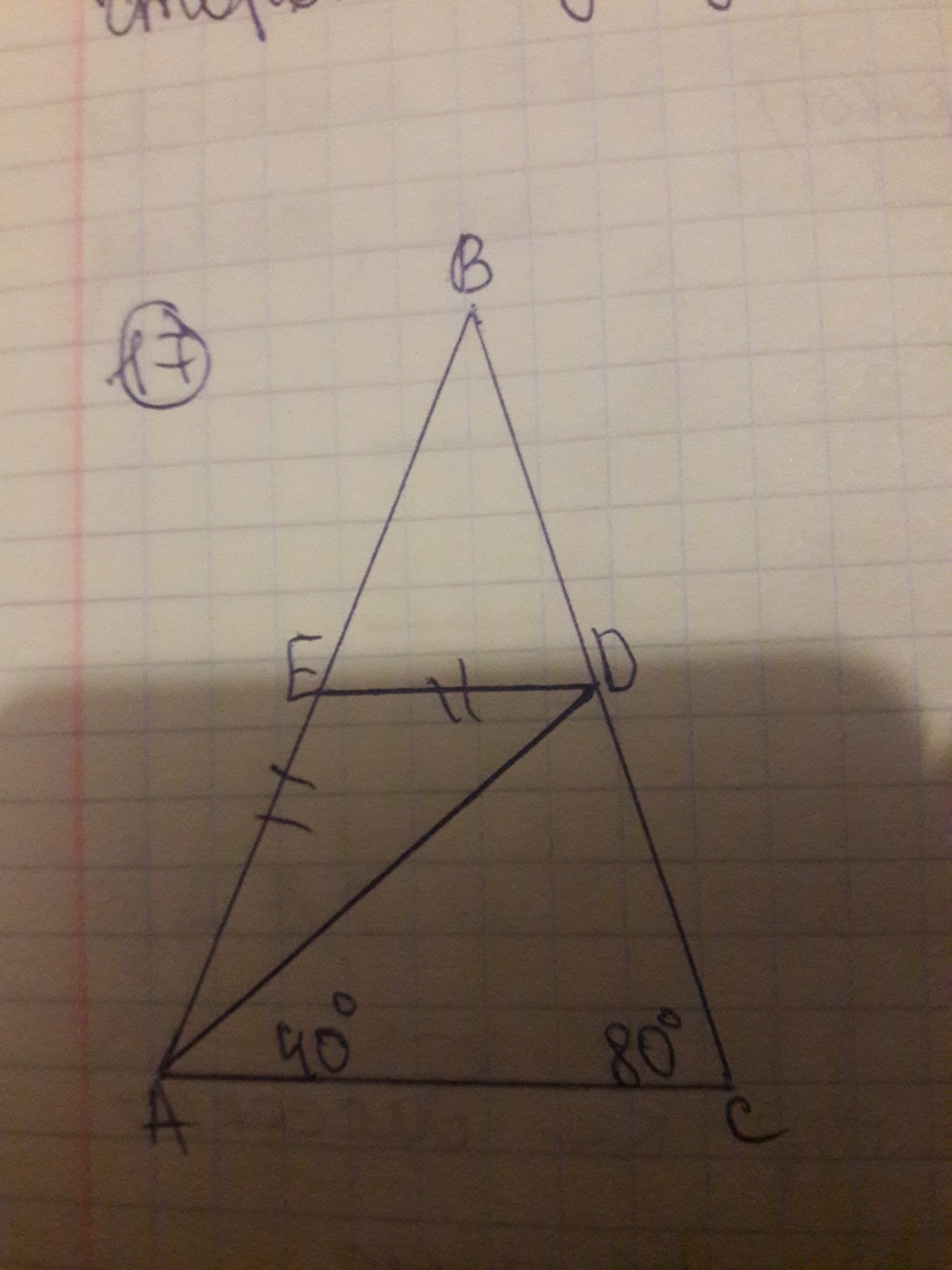 Док-во: в ΔАВС АВ=ВС, т.е. он равнобедренный, а значит углы при основании равны и равны они 80°(т.к. ∠С является углом в основании Δ АВС). Но ∠А состоит из ∠DAC=40° и ∠DAE тоже равного 40°. Теперь рассмотрим ∠DAC и ∠ADE. Они тоже будут равны, но уже как накрест лежащие при пересечении прямых АС и ВD секущей AD, т.е. АС и ВД параллельны
