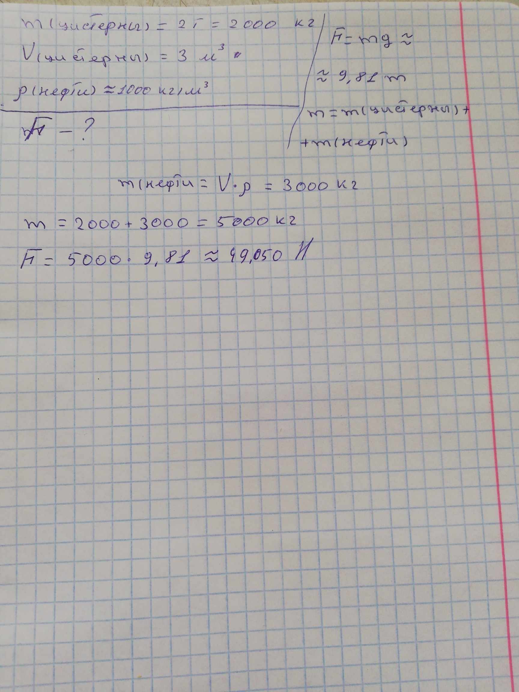 Всё видно на картинке р(нефти) - плотность нефти, F - сила, вычисляется по формуле F=m*G, Где - ускорение свободного падения и g=~9,81 м/с^2