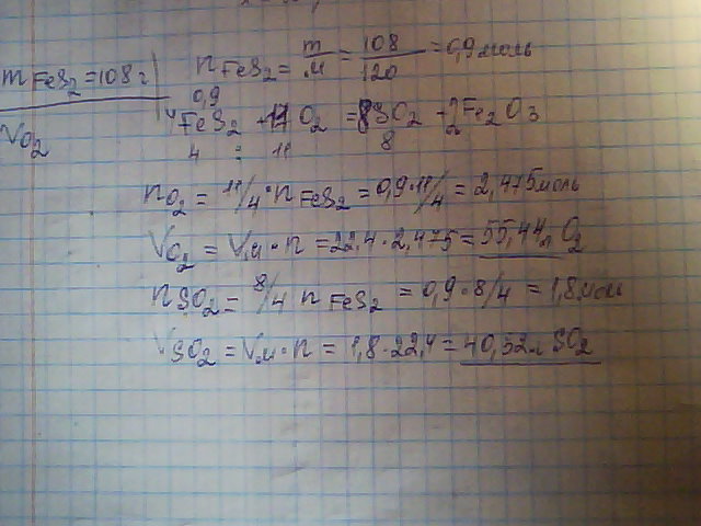 Рассчитайте объем кислорода необходимого для сжигания пирита (FeS2) массой 108 г. до образования оксида железа (III) и оксида серы (IV). Вычислите объем образовавшегося газа.