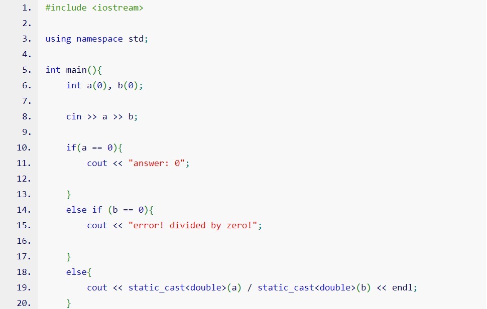 }else cout <<"Ошибка! Деление на 0!" << endl;