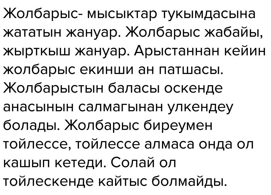 Жолбарыс-мысықтар туқымасына жататын жануар. Жолбарыс жабайы, жыртқыш жануар. Арыстаннан кейін жобарыс екінші аң патшасы. Жолбарыстың баласы өскенде анасының үлкендеу болады. Жолбарыс біреумен төлессе, төлессе алмаса онда ол қашып кетеді. Солай ол төлескенде қайтыс болмайды