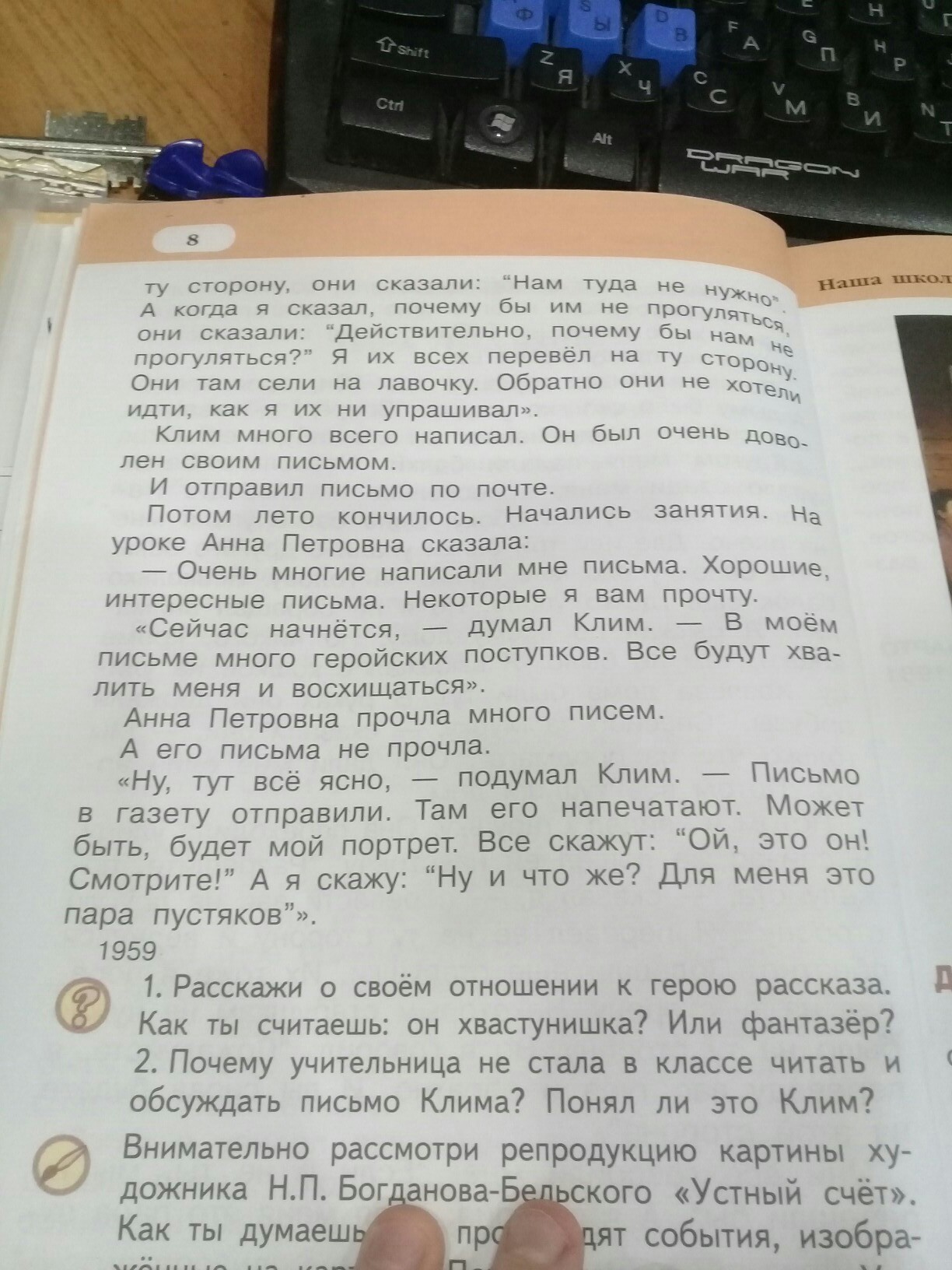 2.Учительница не стала читать письмо так как это не письмо,а какая-то фантастика. Клим не понял этого и опять напридумывал себе,что оно все равно прекрасное письмо. И учительница поступила правильно,она не стала выставлять Клима на посмешищем,что верно с её стороны.