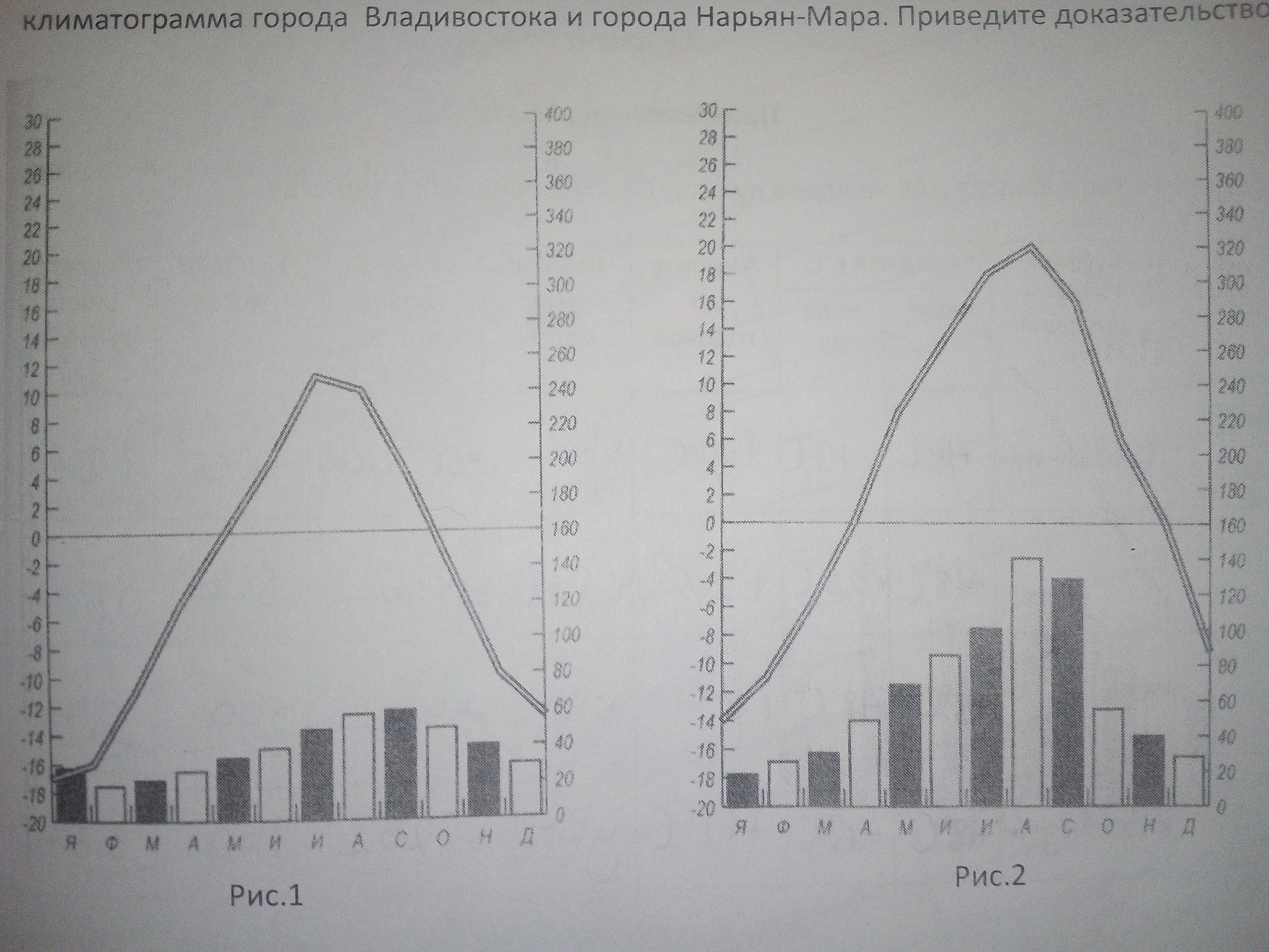 На основе карт атласа и информации, содержащейся в климатограмме, определите какому рисунку соотвествует климатограмма города Владивосток и Нарьян-Мара. Приведите доказательство ваших суждений.