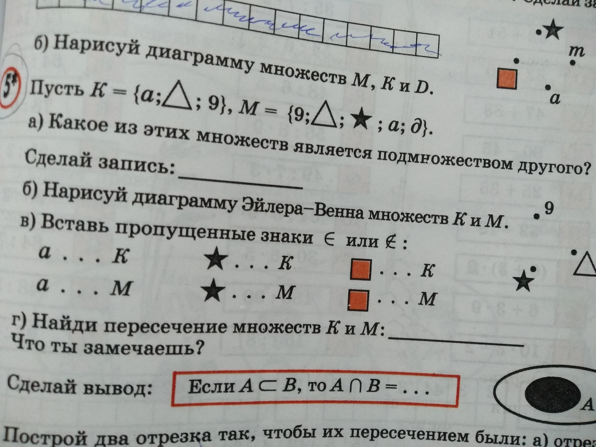 Сначала нужно зарисовать круг это будет М внутри круга М надо ещё нарисовать круг М в зону круга М где не находится круг К надо записать: звезду и д в зону круга М где территория круга К надо записать: А, треугольник и число 9