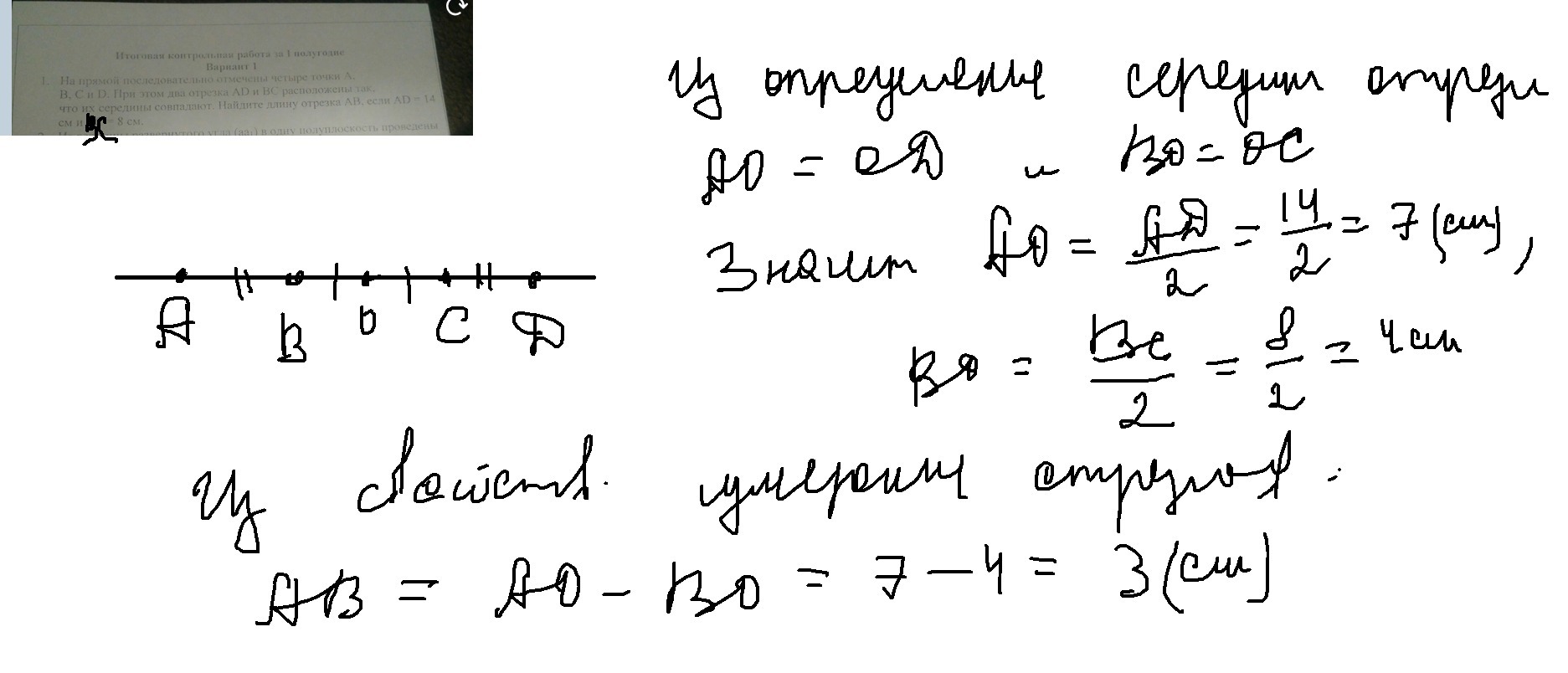 на прямой последовательно отмечены четыре точки A B C и D при этом два отрезка AD и BC расположены Так что их середины совпадают Найдите длину отрезка AB если AD равно 14 см и BC равно 8 см