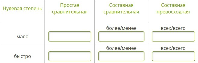 Образуй от наречий все возможные формы степеней сравнения. Если какую-либо форму образовать нельзя, оставляй поле ввода пустым.