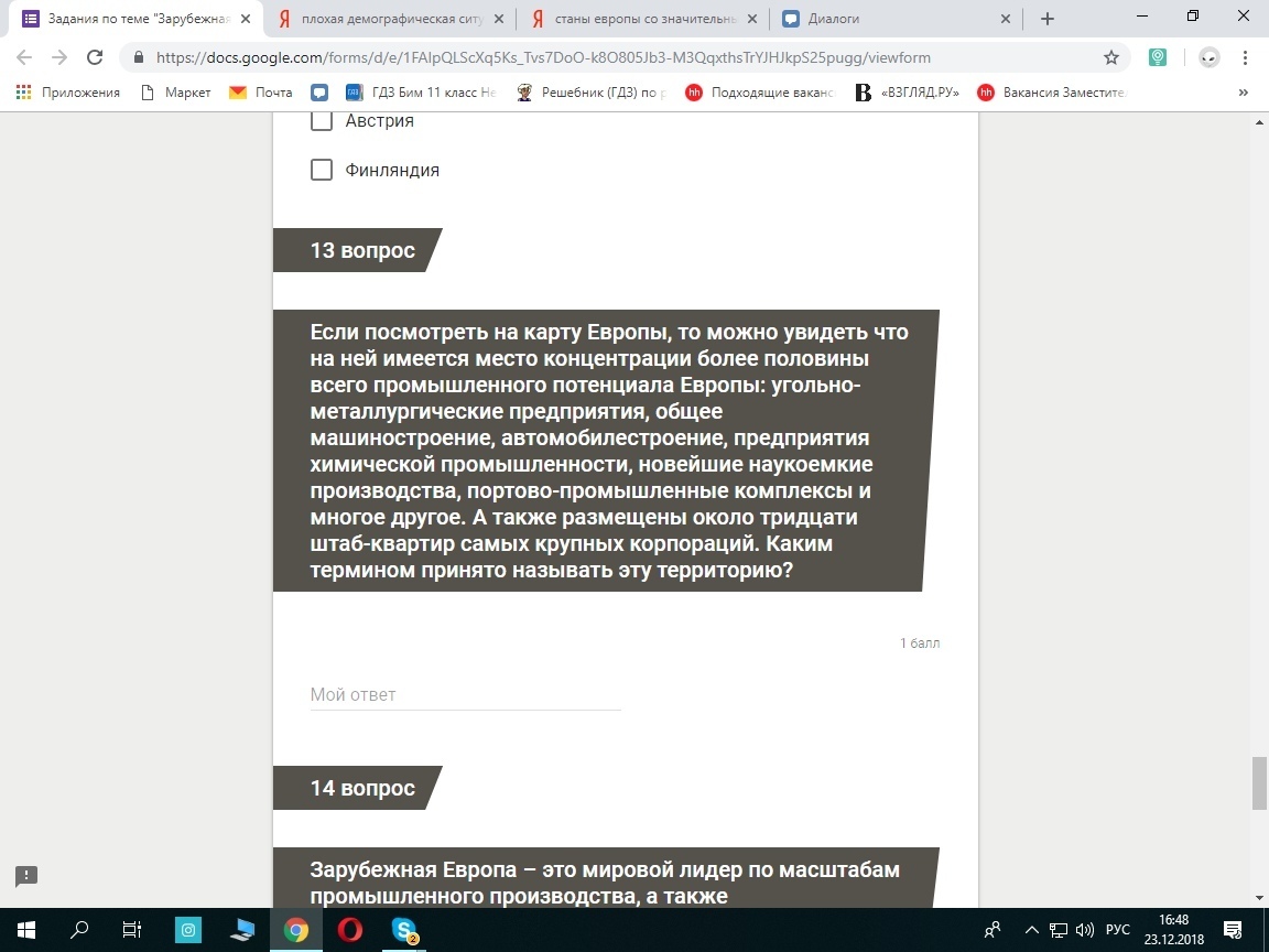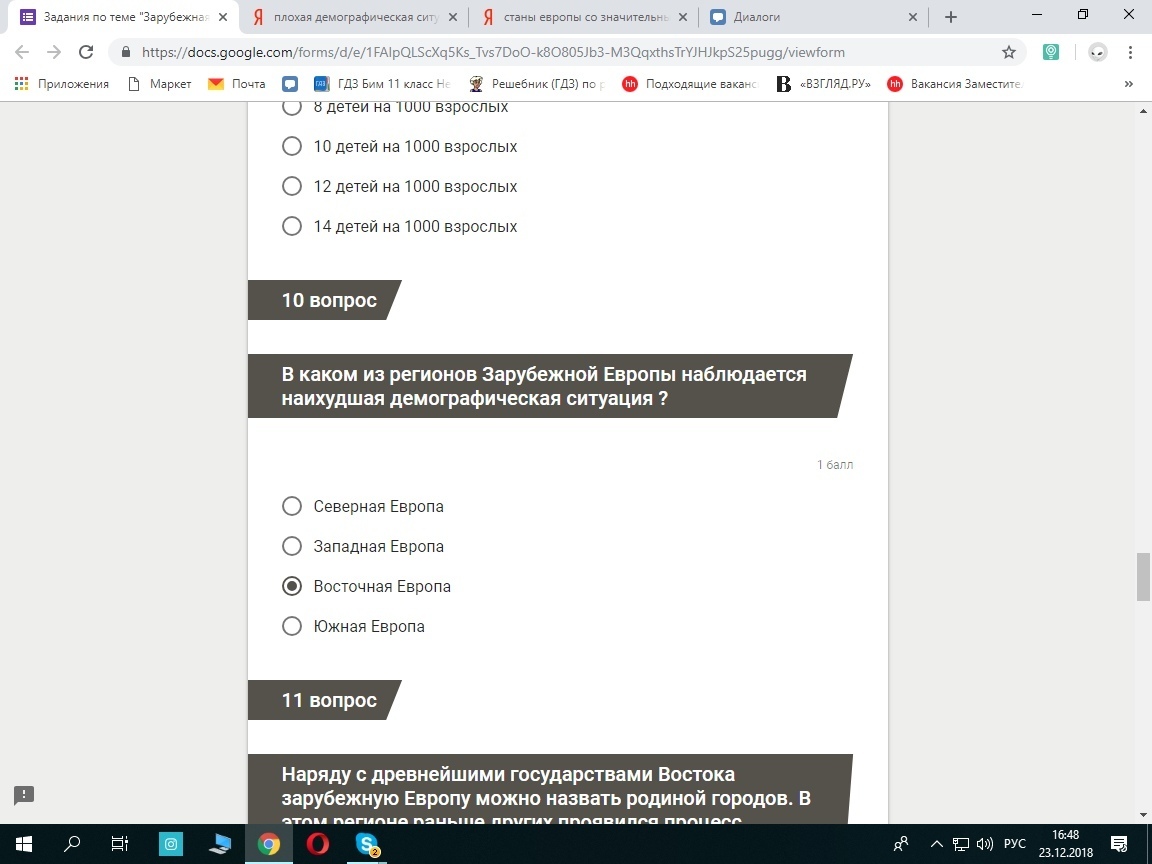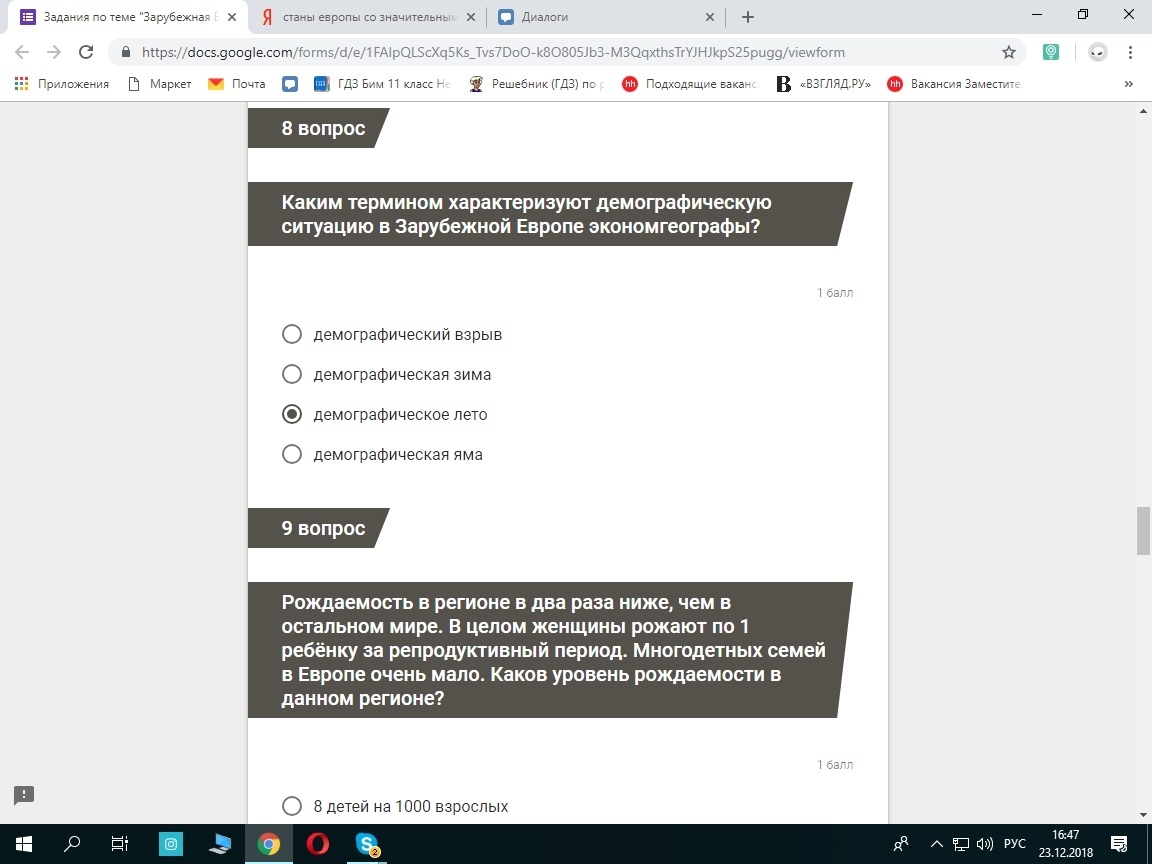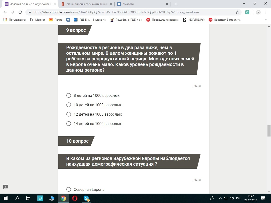 Ответ на последний вопрос: Великобритания,Франция(правильно?) Ответ на 3 вопрос 10 детей на 1000 взрослых.2 ответ Западная Европа. 1 ответ Агломерация. 4 ответ демографическая зима.