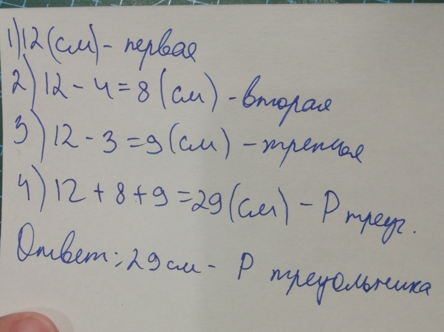 решить задачу пятый класс по математике одна сторона треугольника равна 12 см она на 4 см больше второй стороны и на 3 см больше третьей Вычислите периметр этого треугольника