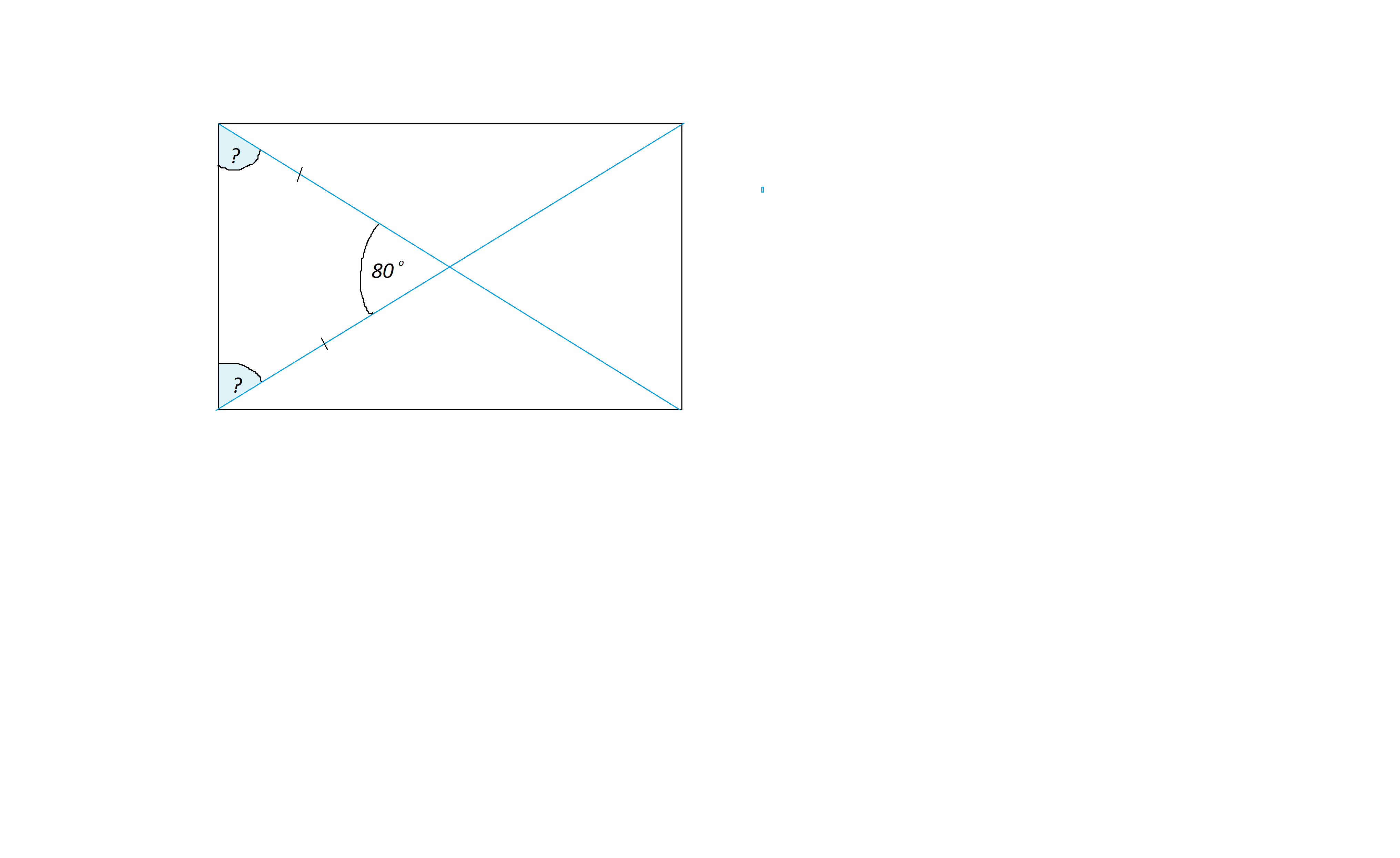 Угол между диагоналями прямоугольника = 80градусам. Найти угол между диагональю и меньшей стороной прямоугольника