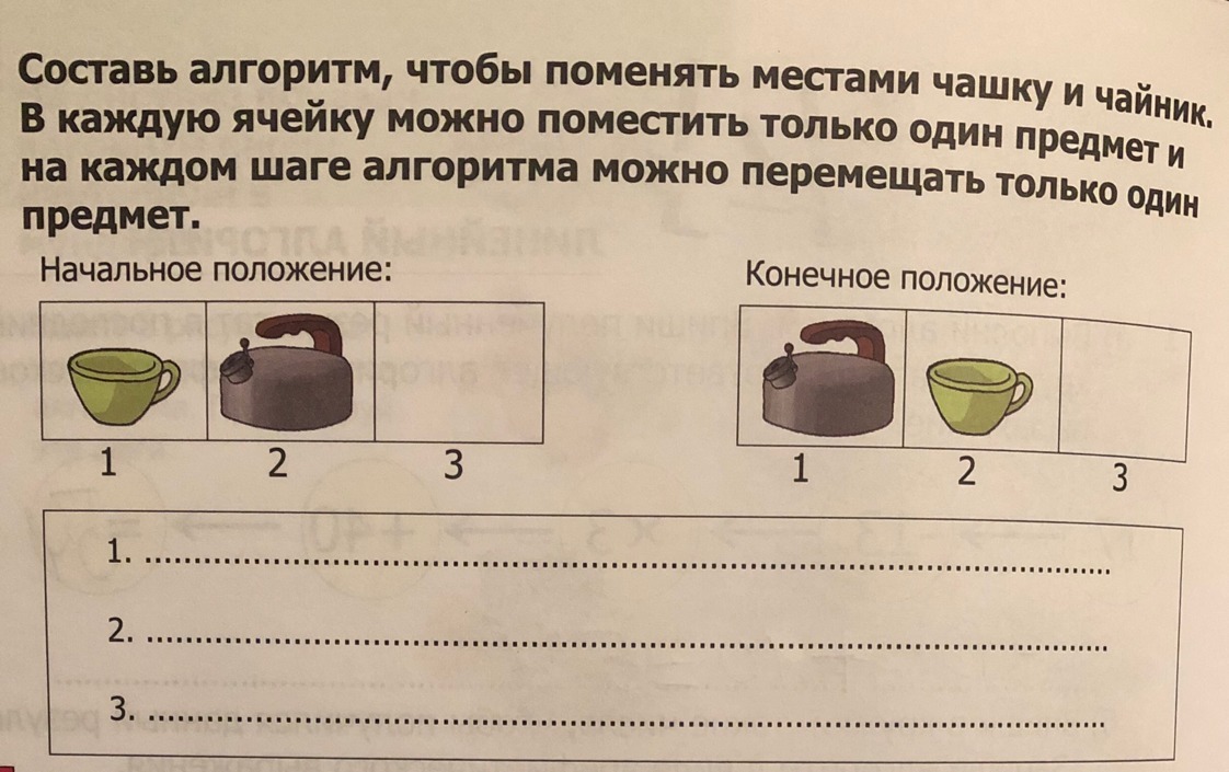 Составь алгоритм, чтобы поменять местами чашку и чайник. В каждую ячейку можно поместить только один предмет и на каждом шаге алгоритма можно перемещать только один предмет.