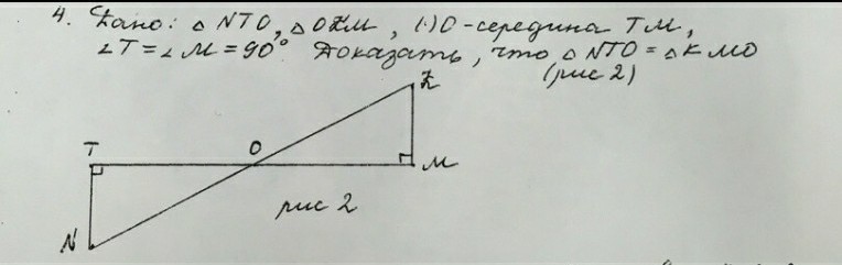 Дано: треугольник NTO, треугольник ОКМ, точка О середина ТМ, угол Т = углу М=90 градусов. Доказать , что треугольник NTO равен треугольнику КМО