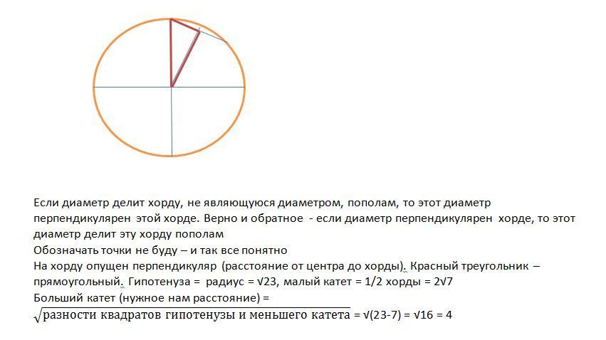 Найдите расстояние от центра окружности радиуса корень из 23 до ее хорды, длина которой равна 2 умножить на корень из 7 .