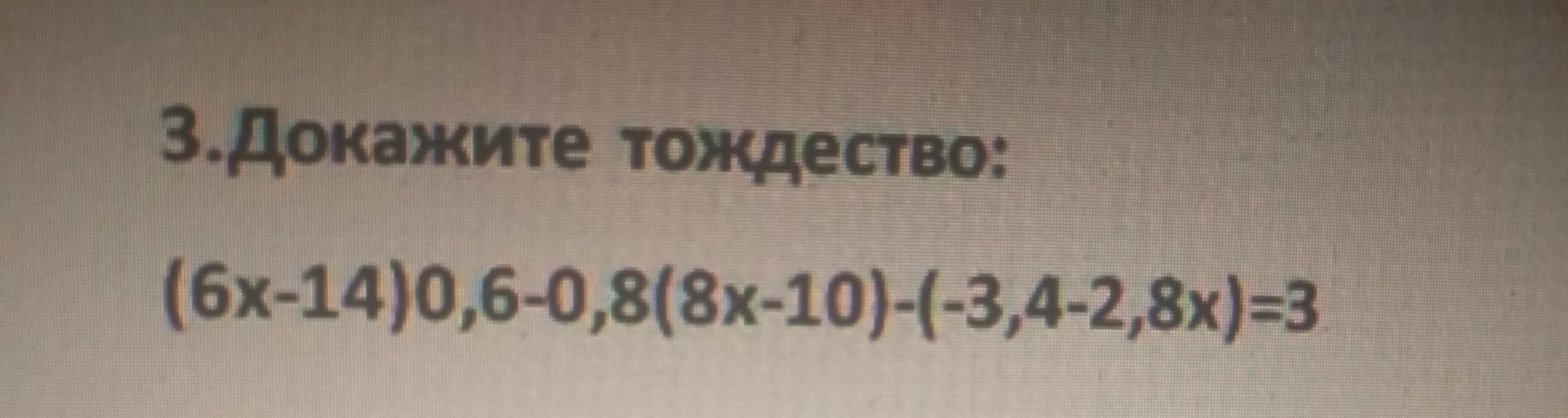 (6x-14)*0,6-0,8*(8x-10)-(3,4-2,8x)=3 ; раскрываем скобки 3,6x-8,4-6,4x+8+3,4+2,8x=3; (3,6x+2,8x-6,4x) + (8+3,4-8,4)=3; 0+3=3; 3=3.