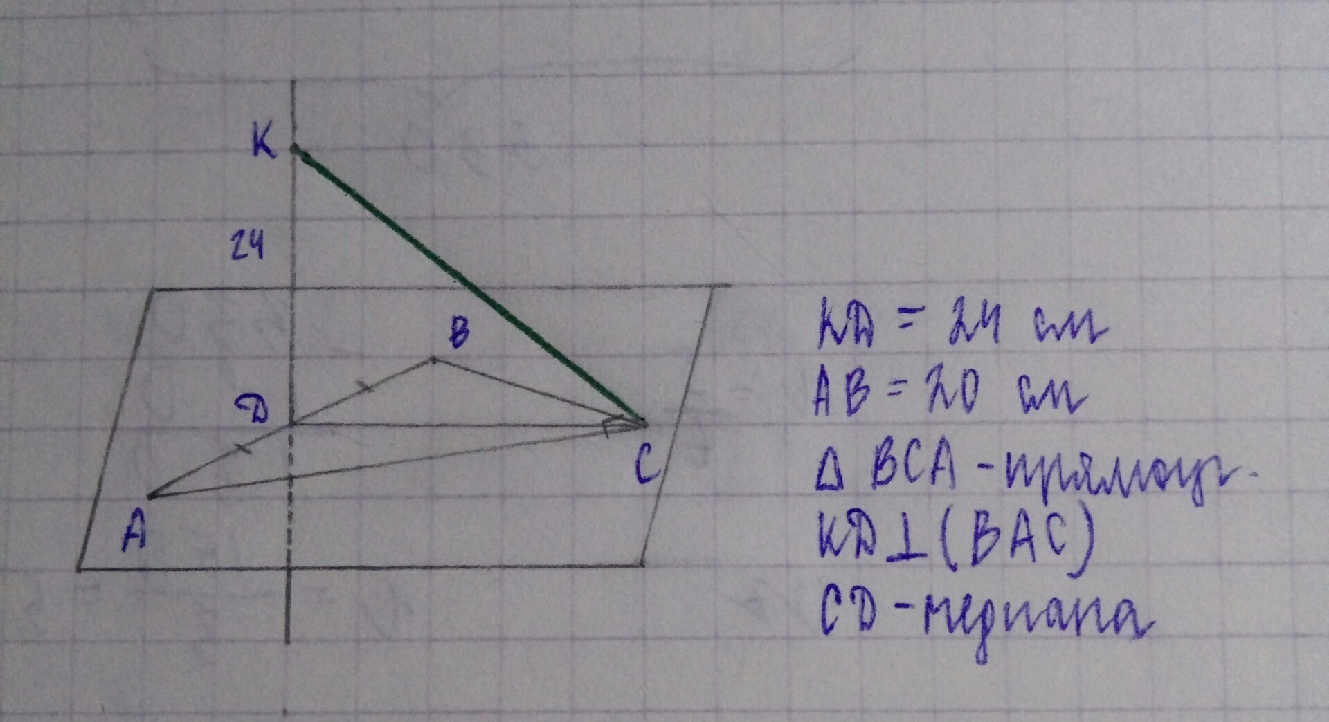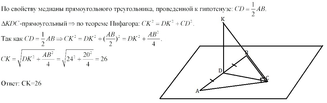 CD - медиана прямоугольного треугольника ABC, проведенная к гипотенузе AB, равной 20 см. Через точку D проведена прямая DK, перпендикулярная плоскости треугольника. Найдите рассиояние от точки K до вершины треугольника C, если DK = 24 см.