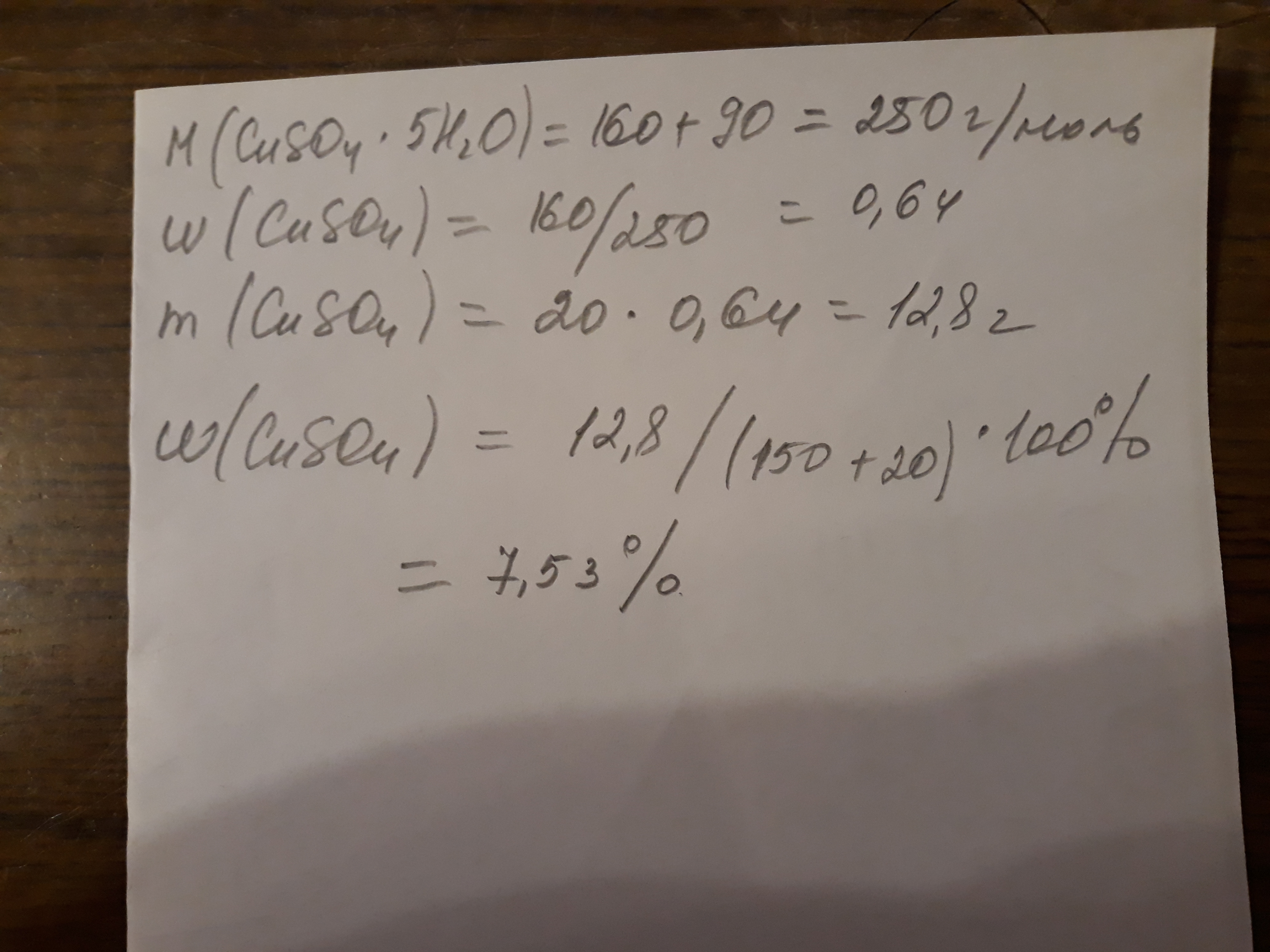 В 150г воды растворено 20г кристаллогидрата CuSO4.5H2O Вычислите массовую долю кристаллогидрата.Пожааалуйста
