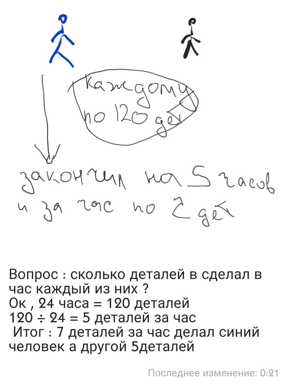 2-м работникам нужно сделать по 120 деталей каждому. Один из них сделал всё раньше чем второй на 5 часов, потому что за 1 час он делал на 2 деталя больше чем другой. Сколько деталей в час делал каждый из них.?