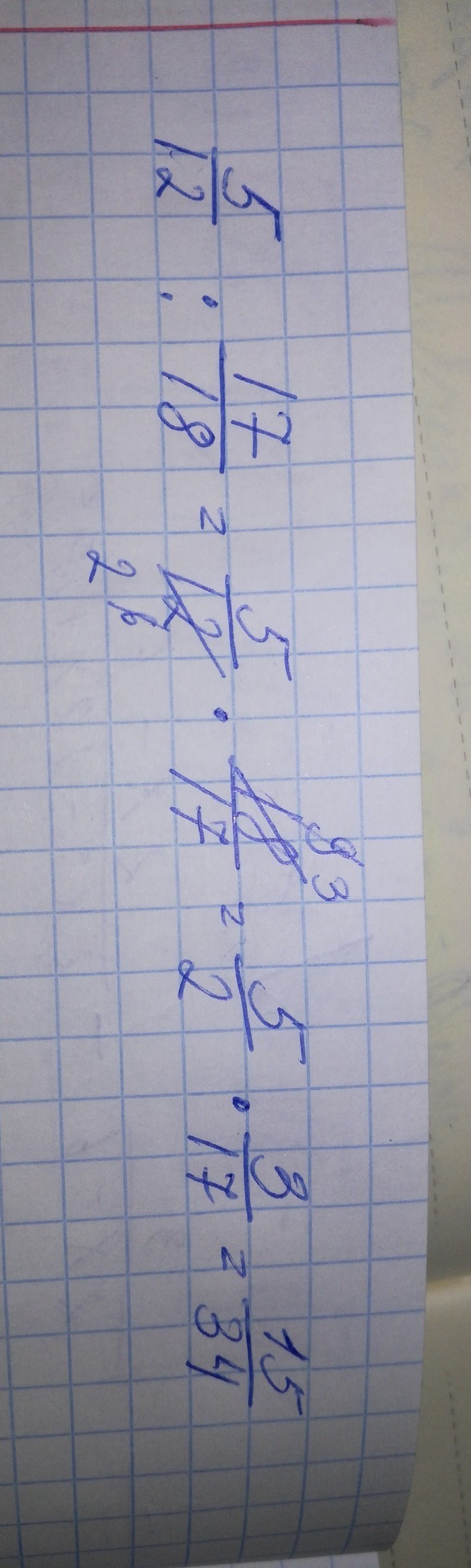 5/12 : 17/18 = 5/12 * 18/17 = упрощаем дробь 15/34 * 6/6 = 15/34