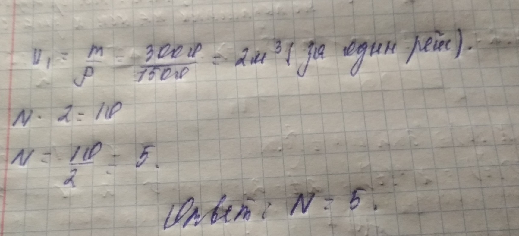 Грузовой автомобиль за один рейс может увести 3 т песка плотностью 1500кг/м^3. Сколько рейсов он должен сделать, чтобы перевести 10 м^3 песка?