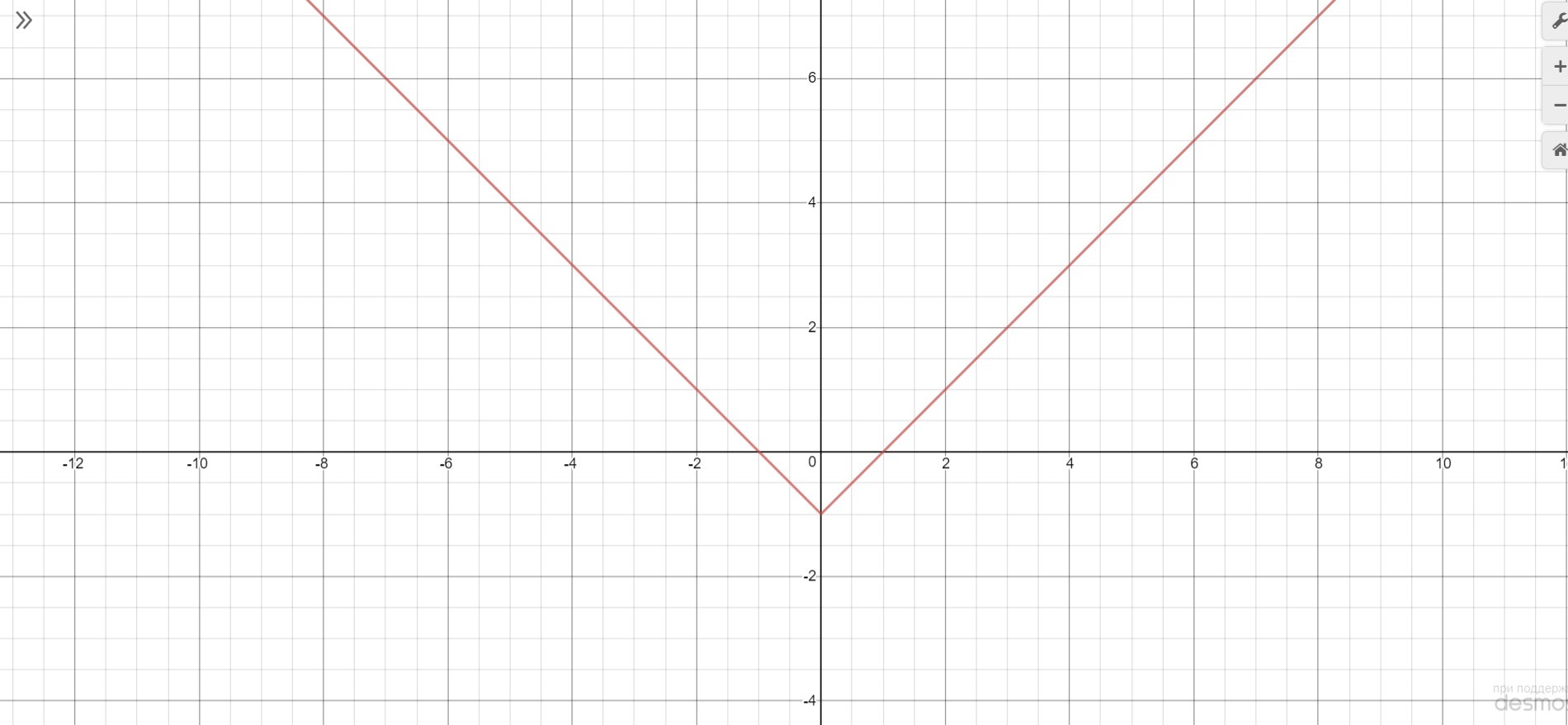 2) модуль x значит, что на каждый икс (меньше или больше нуля) будет положительный результат. Графиком функции должны быть 2 прямые, которые пересекаются в 1 точке. Если бы это был просто модуль x, то эта точка бы была (0;0). На так, как в уравнении присутствует -1, то график смещается вниз на 1 единицу и теперь графики пересекаются в точке (0; -1).