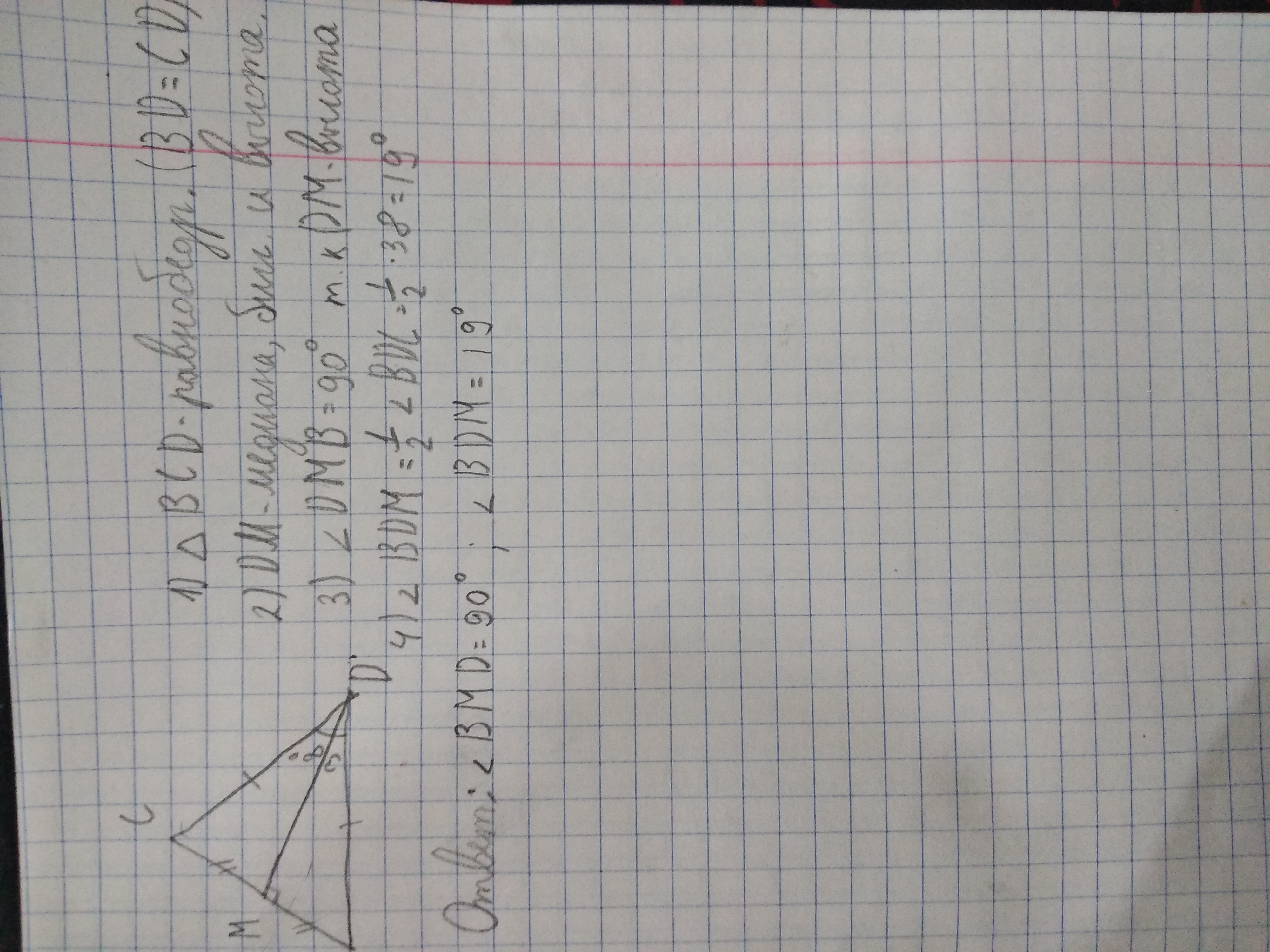 В треугольнике BDC стороны BD и CD равны, DM - медиана, угол BDC равен 38 градусов. Найдите углы BMD и BDM