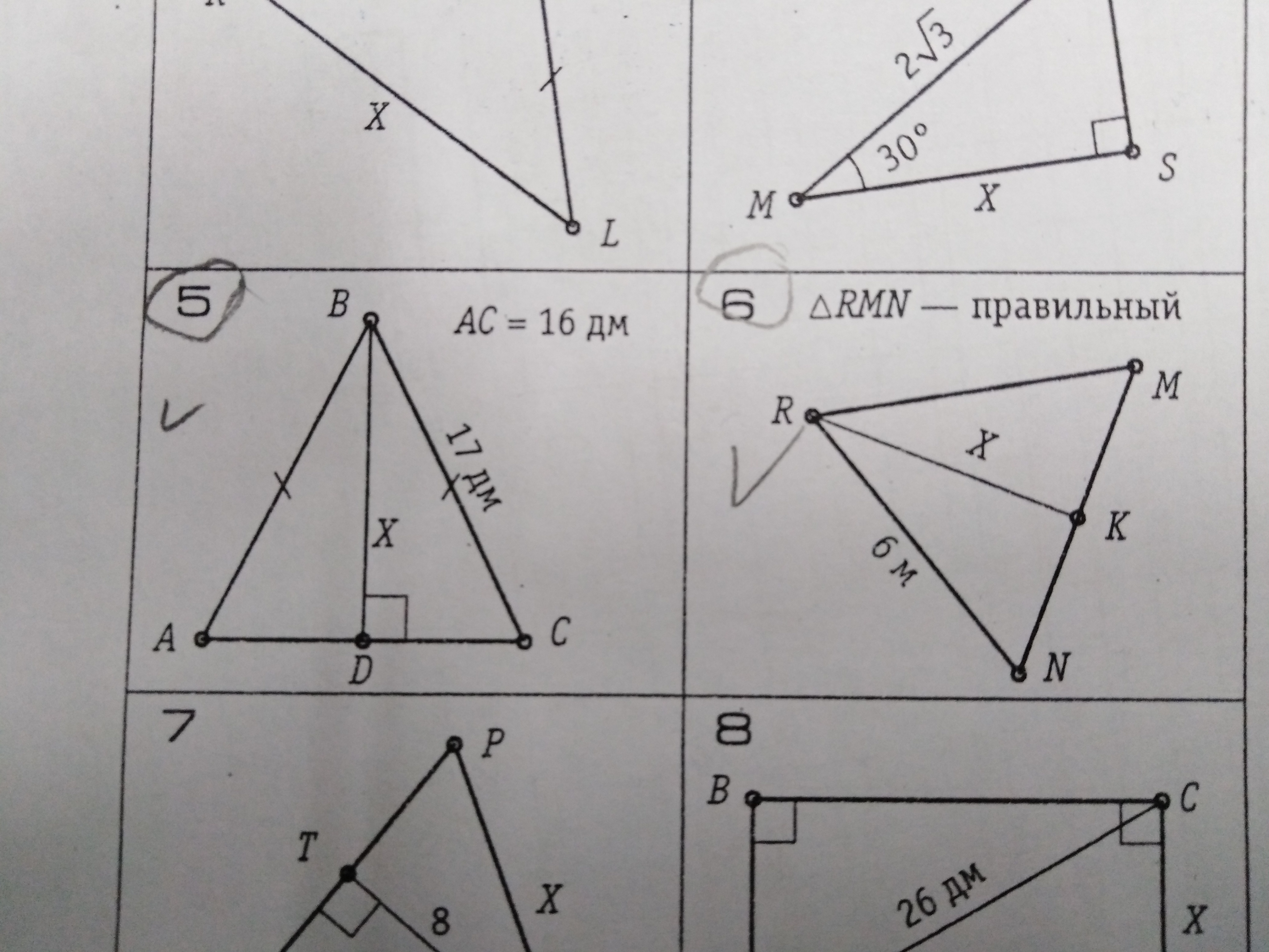 в пятой задаче сперва находим AD=DC=16/2= 8 дм (т.к. треугольник равнобедренный). BD у нас катет прямоугольного треугольника BDC и в то же время высота для треугольника ABC - это нам и надо найти.