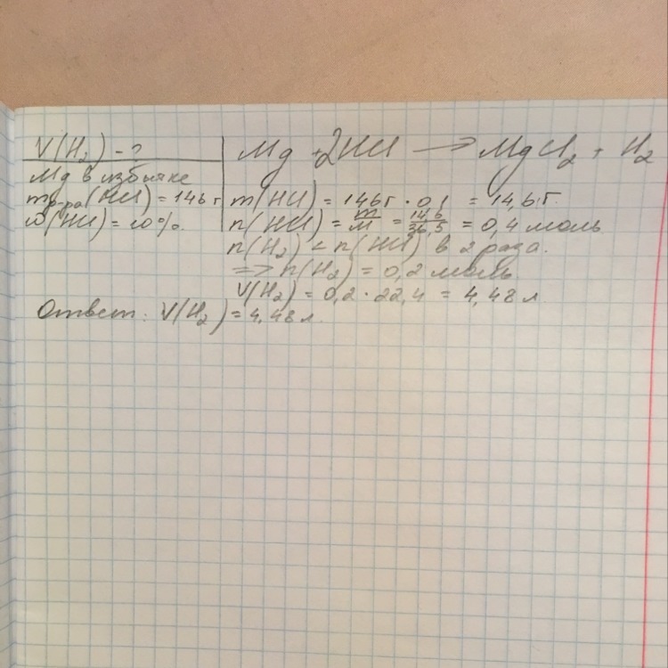 какой обьём водорода выделиться в нормальных условиях при взаимодействии избытка магния и раствора соляной кислоты 146 г с массой долей кислоты 10%?