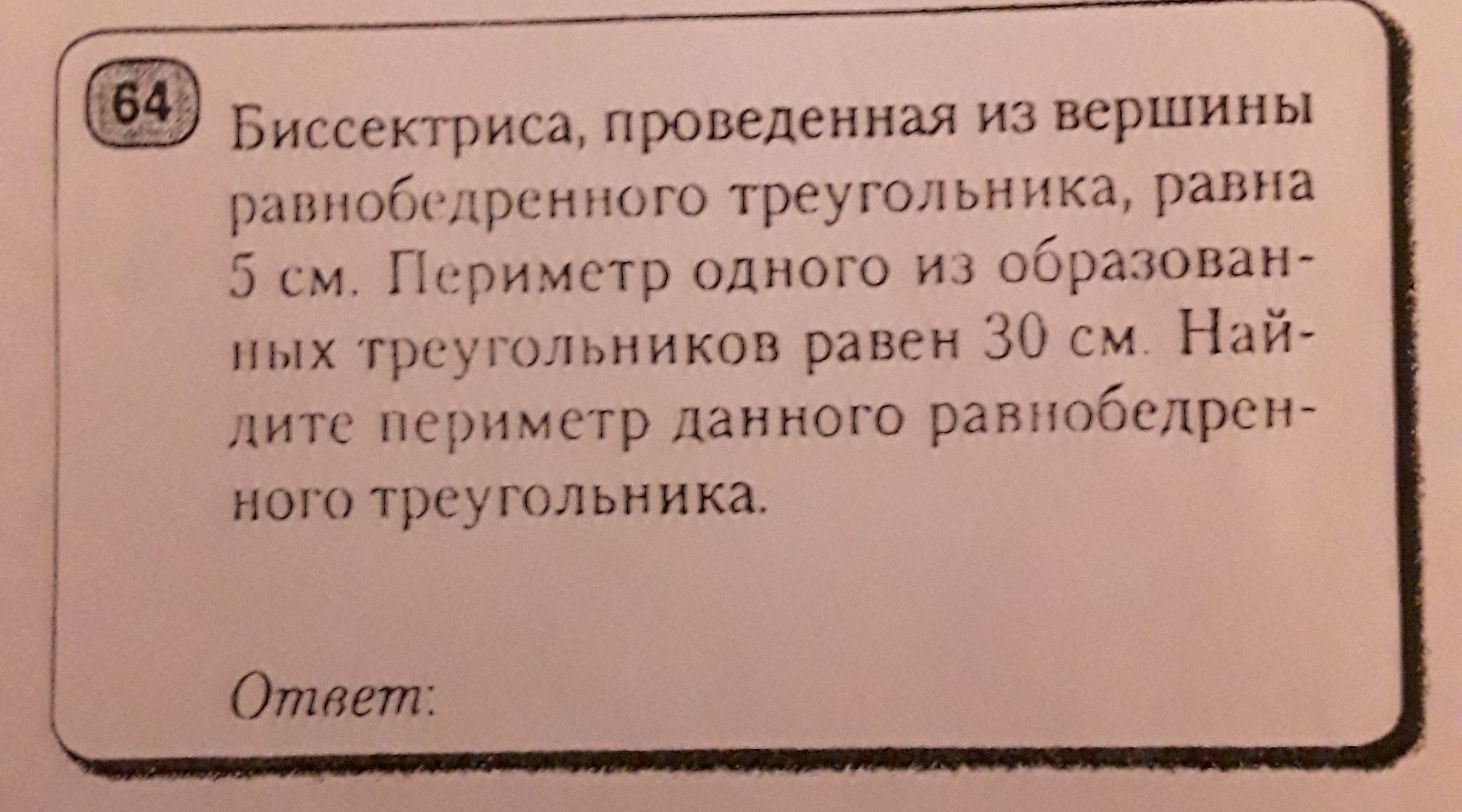Пусть основание х, боковые у, высота р/б-го она же медиана, тогда по условию 5+х/2+у=30, 10+х+2у=60, периметр р=(х+2у)=50 см -ответ