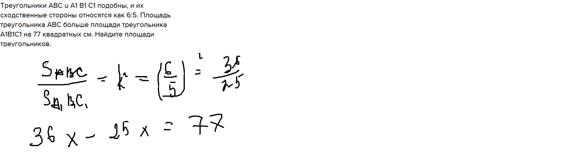 Треугольники ABC u A1 B1 C1 подобны, и их сходственные стороны относятся как 6:5. Площадь треугольника ABC больше площади треугольника A1B1C1 на 77 квадратных см. Найдите площади треугольников.