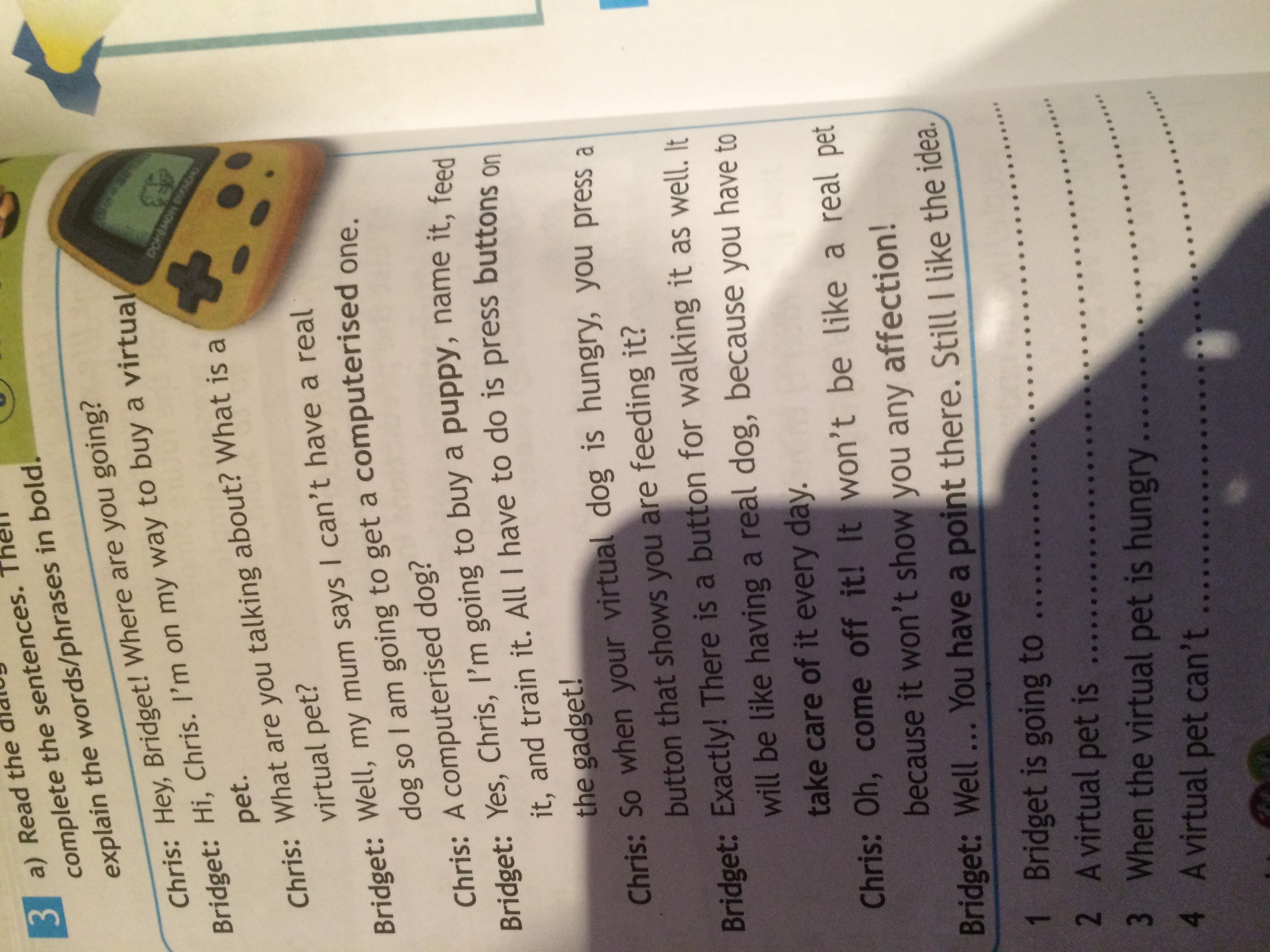 Крис: Привет, Бриджит! Куда ты направляешься? Бриджит: Привет, Крис. Я собираюсь купить виртуального питомца. виртуальный питомец? собака, так что я собираюсь получить компьютерную. это, и тренируй это. Все, что мне нужно сделать, это нажать кнопки на Крис: О чем ты говоришь? Что такое Бриджит: Ну, моя мама говорит, что у меня не может быть настоящего Криса: компьютеризированная собака? Бриджит: Да, Крис, я собираюсь купить щенка, назвать его, покормить гаджет. Крис: Итак, когда ваша виртуальная собака голодна, вы нажимаете кнопку, которая показывает, что вы кормите ее? Бриджит: Точно! Также есть кнопка для ходьбы. это будет как настоящая собака, потому что ты должен заботиться об этом каждый день. Крис: О, отойди! Он не будет похож на настоящего питомца, потому что он не проявит к вам привязанности! Бриджит: Хорошо ... У тебя есть точка зрения. Тем не менее, мне нравится идея.