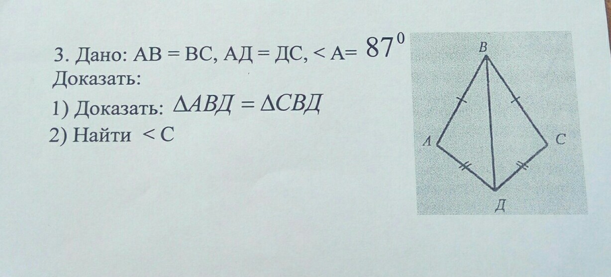 Значит если треуголики АВС=СВД, то угол С = углу А и равен 87 градусов.