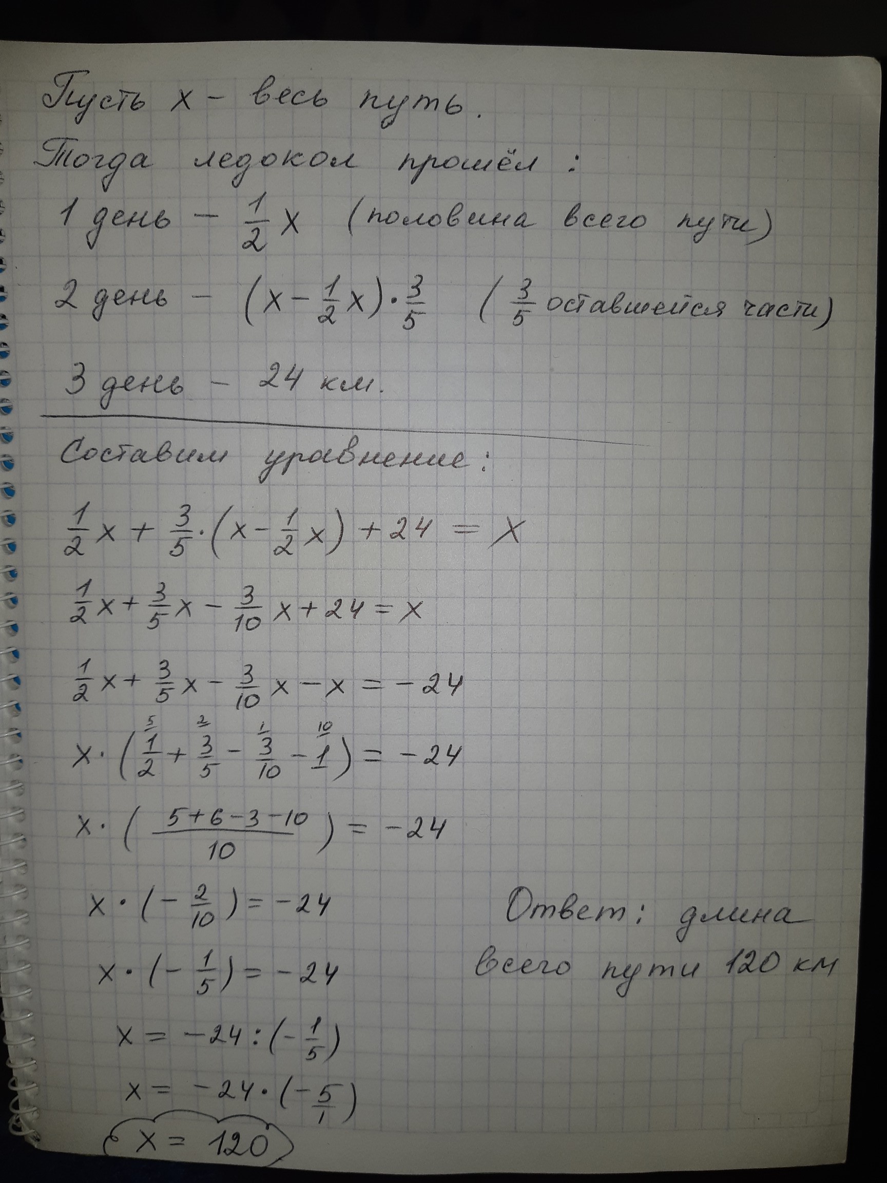 Задача: Ледокол двигался три дня. За первый день он прошел половину всего пути, во второй день-3/5 оставшейся части, за третий день.-последние 24 км.