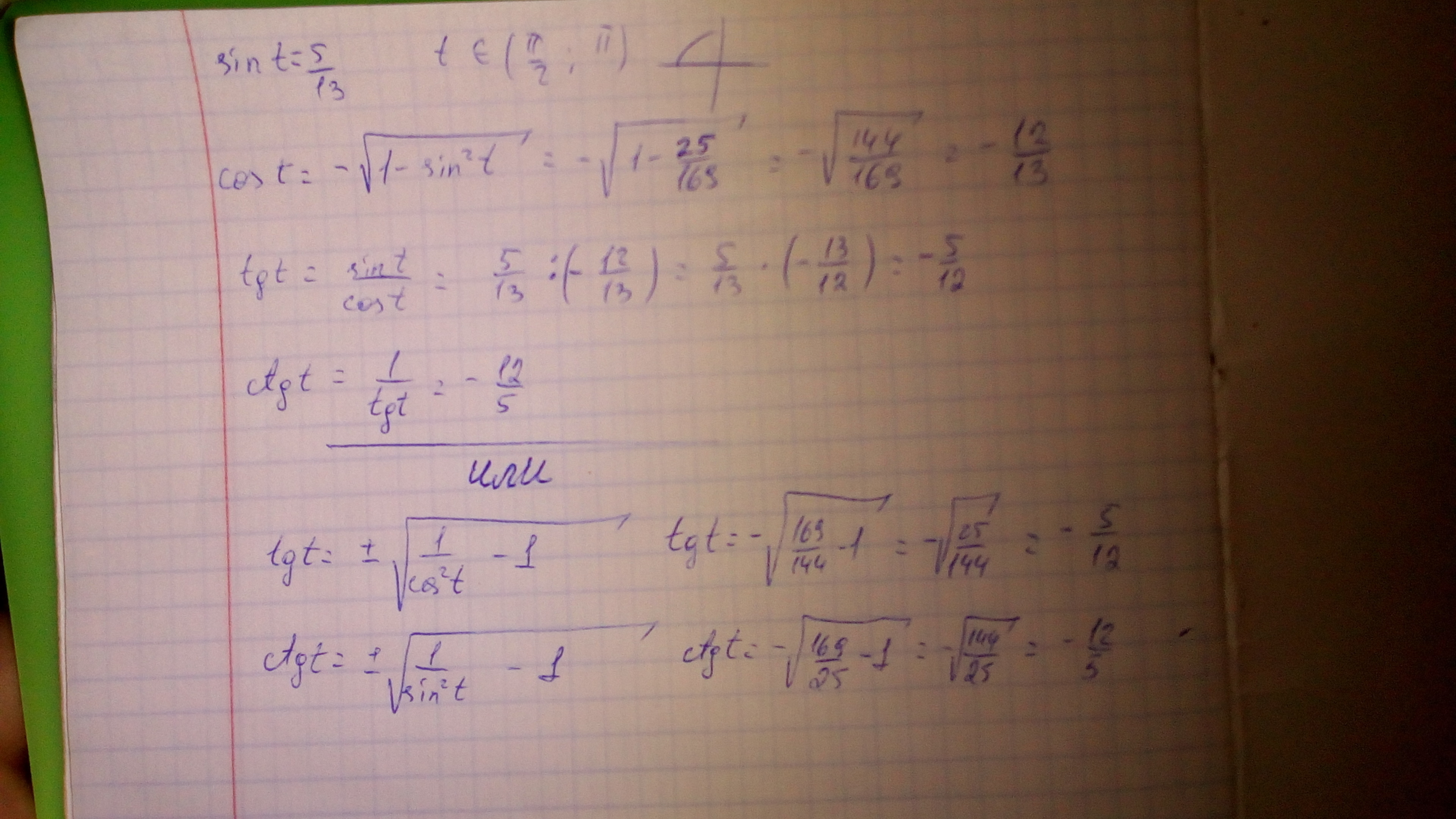 Известно, что sin t = 5/13; t ∈ (П/2; П). Вычислите cos t; tg t; ctg t.
