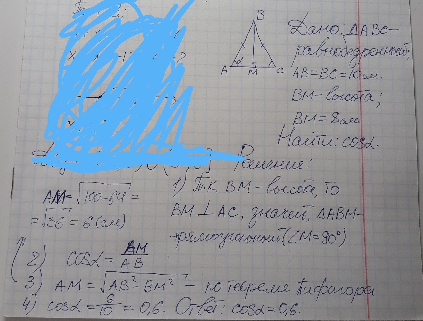 В равнобедренном треугольнике ABC (AC=BC) боковые стороны равны по 10 см,высота опущенная на осонование,равна 8 см.Найдите косинус угла А