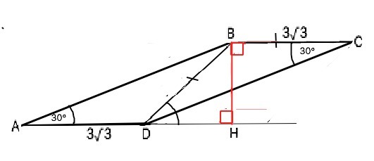 Вариант решения. Угол BDC=30°, угол СDH=углу ВСD=30° (накрестлежащие) ⇒ угол ВDH=60°⇒ BH=BD•sin60°=3√3•√3/2=9/2. ⇒ S(ABCD)=AD•BH=3√3•9/2=27√3/2