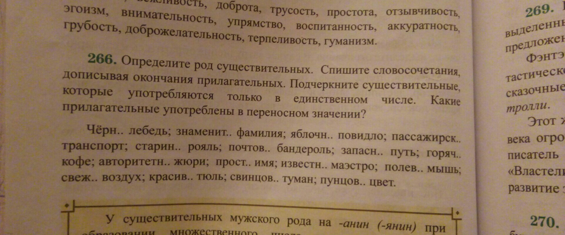 Чёрный лебедь (мужской род), знаменитая фамилия (женский род), яблочное повидло (средний род), пассажирский транспорт (мужской род), старинный рояль (мужской род), почтовый бандероль (женский род), запасной путь (мужской род), горячий кофе (мужской род), авторитетное жюри (средний род), простое имя (средний род), известный маэстро (мужской род), полевая мышь (женский род), свежий воздух (мужской род), красивый тюль (мужской род), свинцовый туман (мужской род), пунцовый цвет (мужсккой цвет).