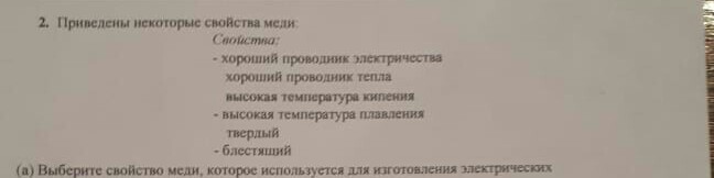 приведены некоторые свойства меди свойства хороший проводник электричества хороший проводник тепла высокая температура кипения высокой температуры плавления твердой блестящий Выбери свойства меди которые используют для изготовления электрических проводов