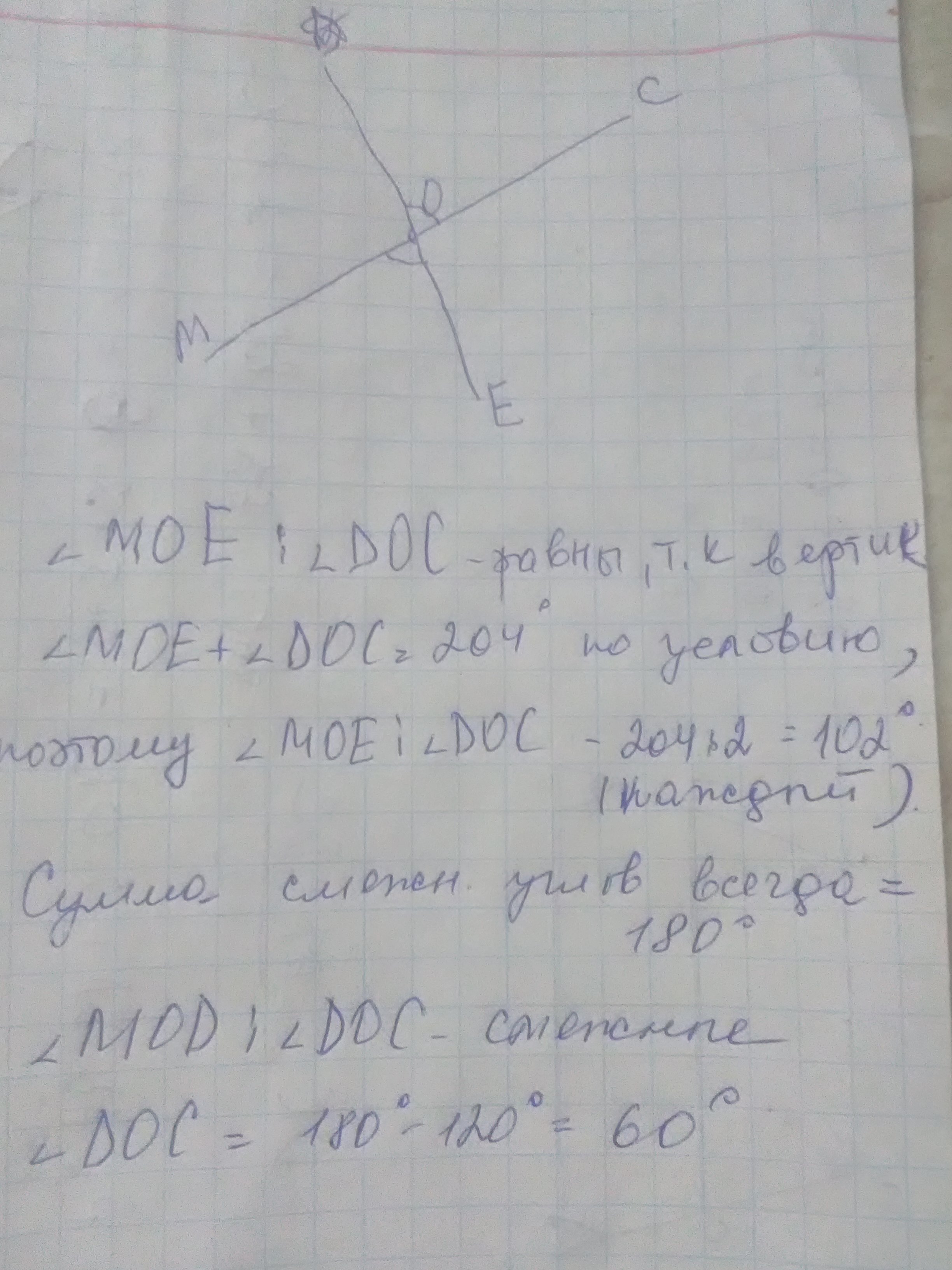 Сумма вертикальных углов МОЕ и ДОС,образованных при пересечении прямых МС и ДЕ,равна 204 °. Найдите угол МОД