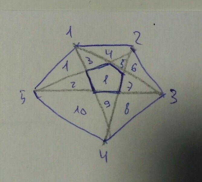 все посчитано , пятиугольник с дестью треугольниками и ещё одним пятиугольником