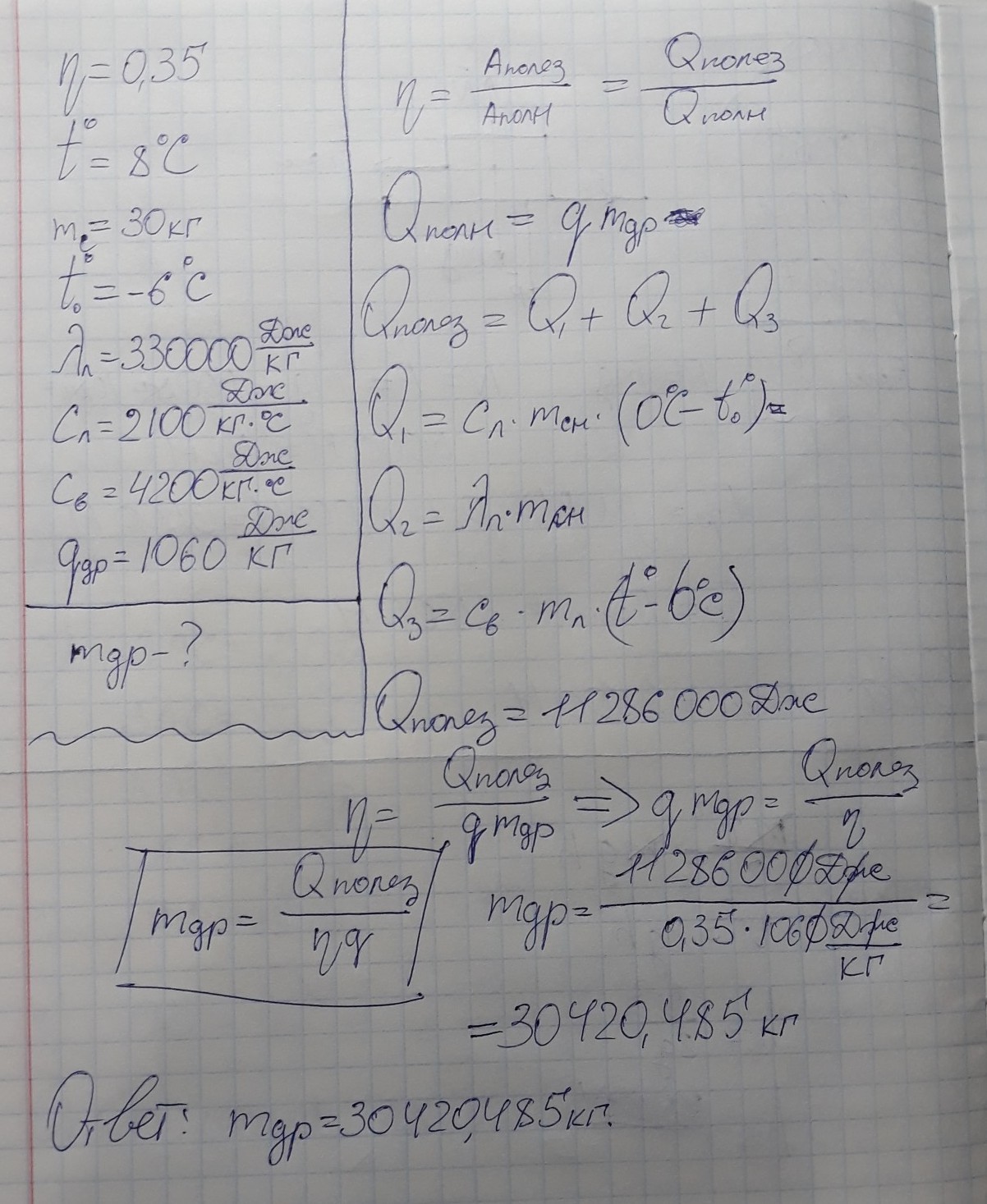 Сколько дров надо сжечь в топке паровой машины с КПД=35 %, чтобы получить воду при 8 °С из снега массой 30 кг, взятого при температуре −6 °С. (Удельная теплота плавления снега λ=330000Джкг, удельная теплоёмкость снега с1=2100Джкг⋅°С, удельная теплоёмкость воды с2=4200Джкг⋅°С, удельная теплота сгорания дров q=10⋅106Джкг).