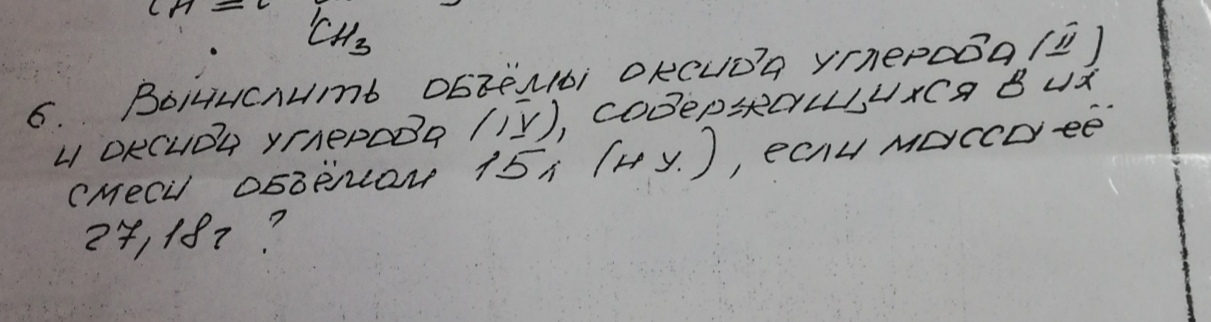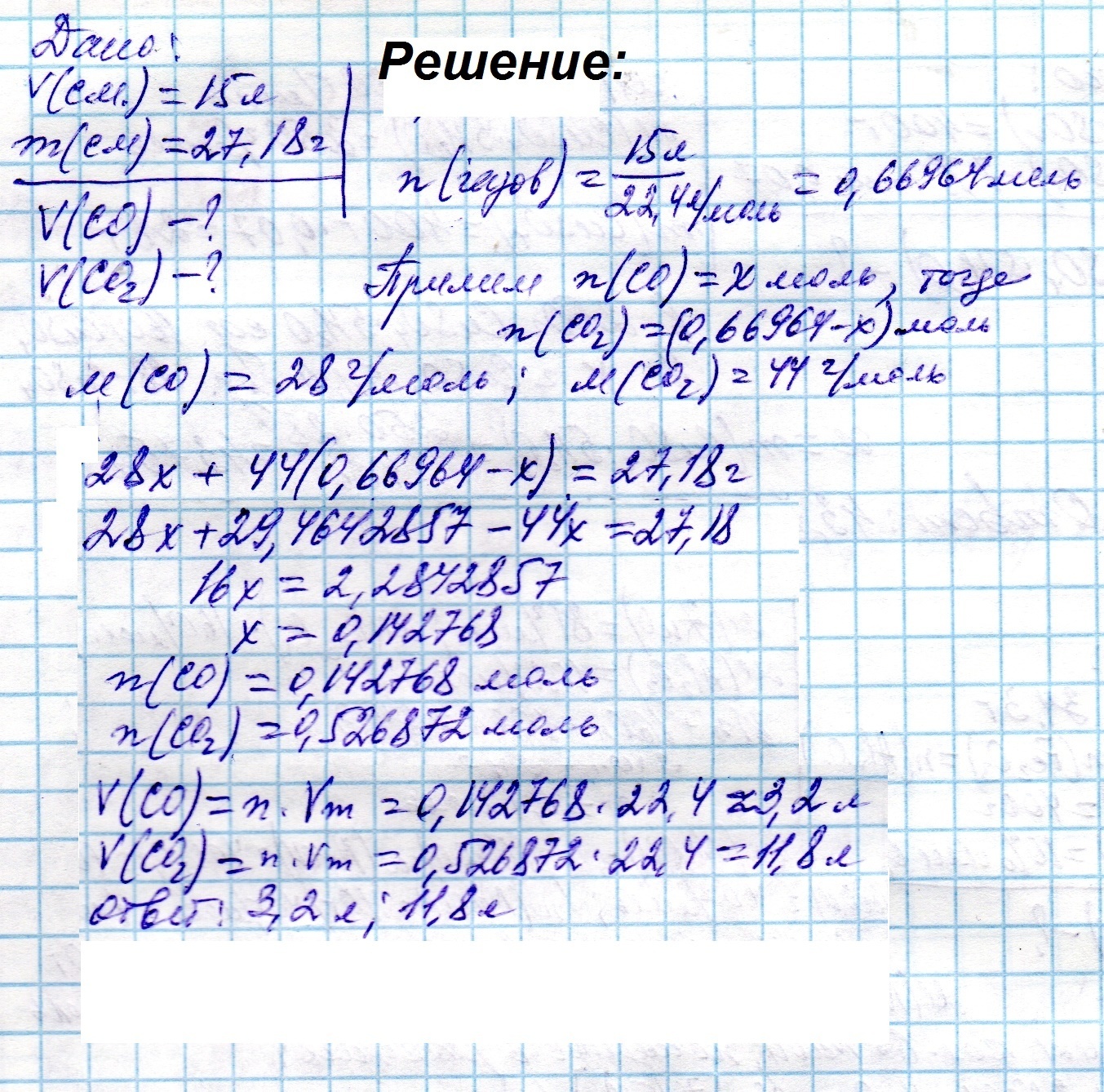 Вычислите объём оксида углерода (2) и оксида углерода (4) содержащихся в их смеси объемом 15 л если масса её 27.18 г