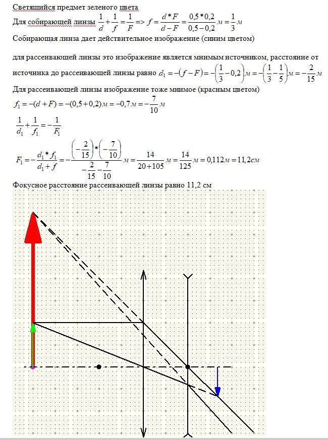 Точечный источник света помещен на оптической оси собирающей линзы с фокусным расстоянием 0.2м на расстоянии 50 см от нее. По другую сторону линзы в ее фокальной плоскости помещена рассеивающая линза. Каким должно быть фокусное расскаяние рассеивающей линзы, чтобы мнимое изображение в ней источника совпало с самим источником?