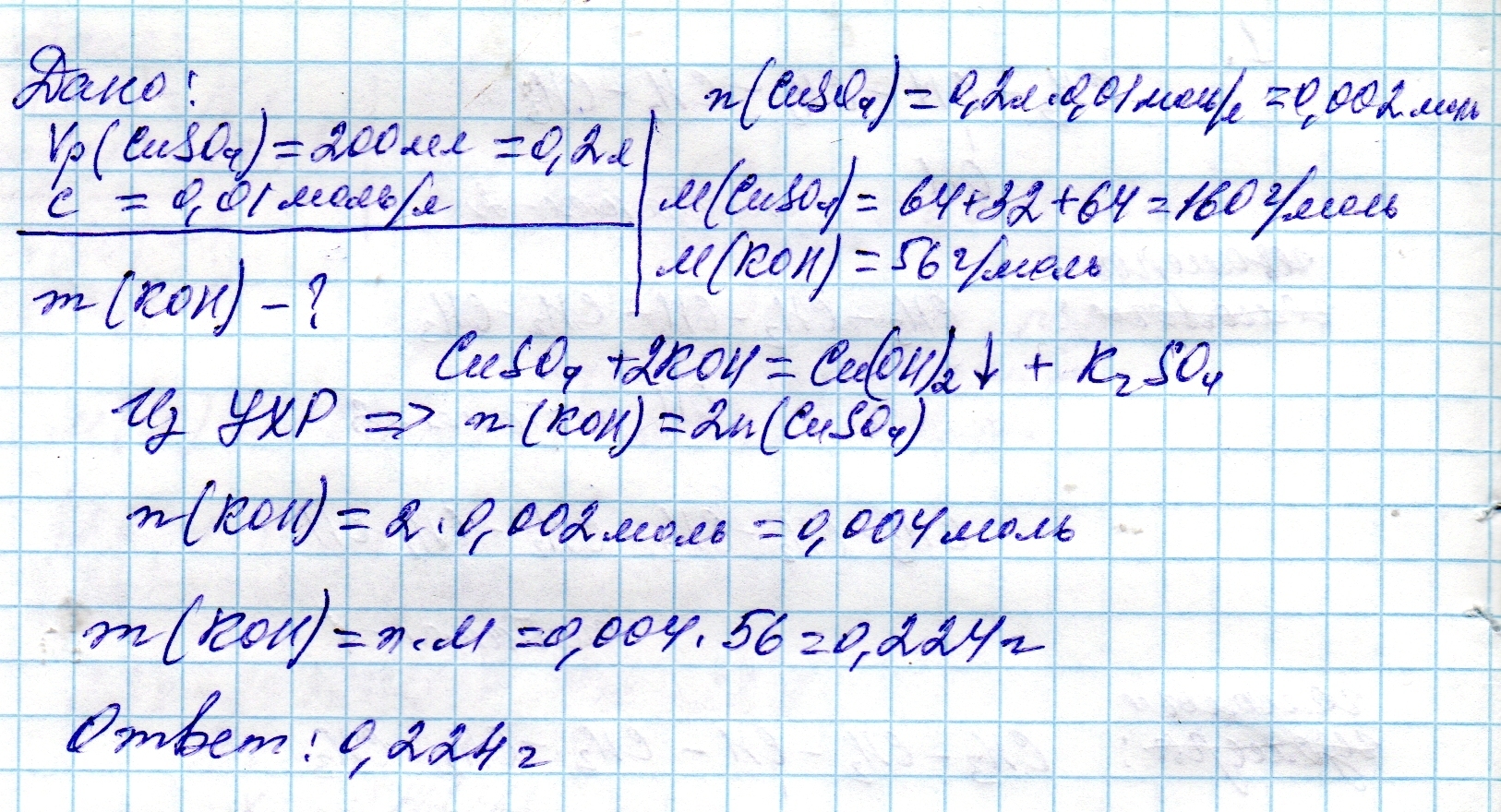 Какая масса гидроксида калия нужна для осаждения гидроксида меди(3)при действии на 200 мл раствора сульфата меди(2) с концентрацией 0.01моль/л