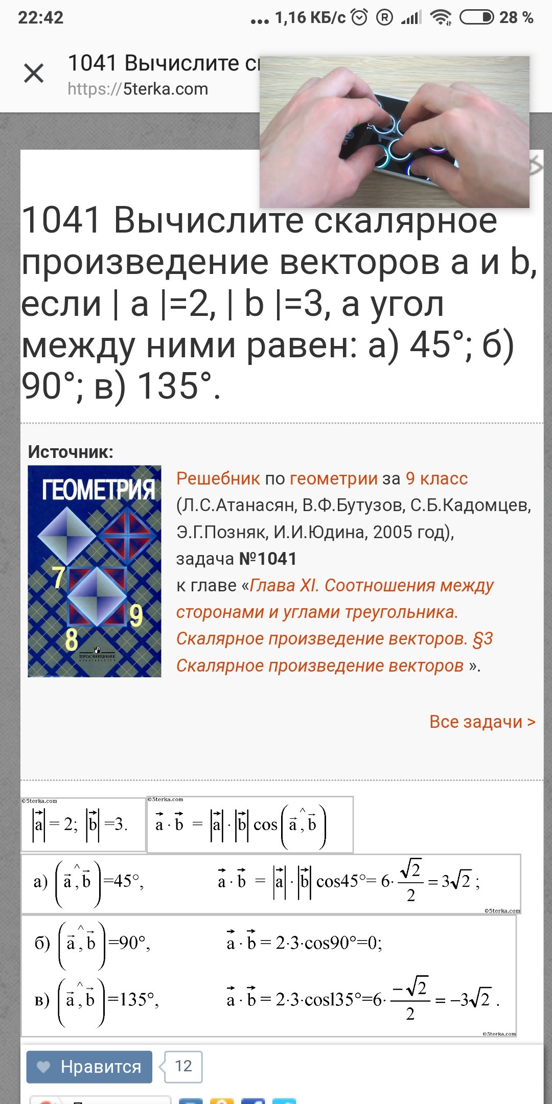вычислите скалярное произведение векторов а и б, если а=3 ,б=4,а угол между ними равен 45градусов