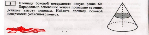 Боковая конуса пропорциональна R², у малого r=R/2, т.е. Sмалого уменьшилась в 4 раза, осталось 3/4 на усеченный