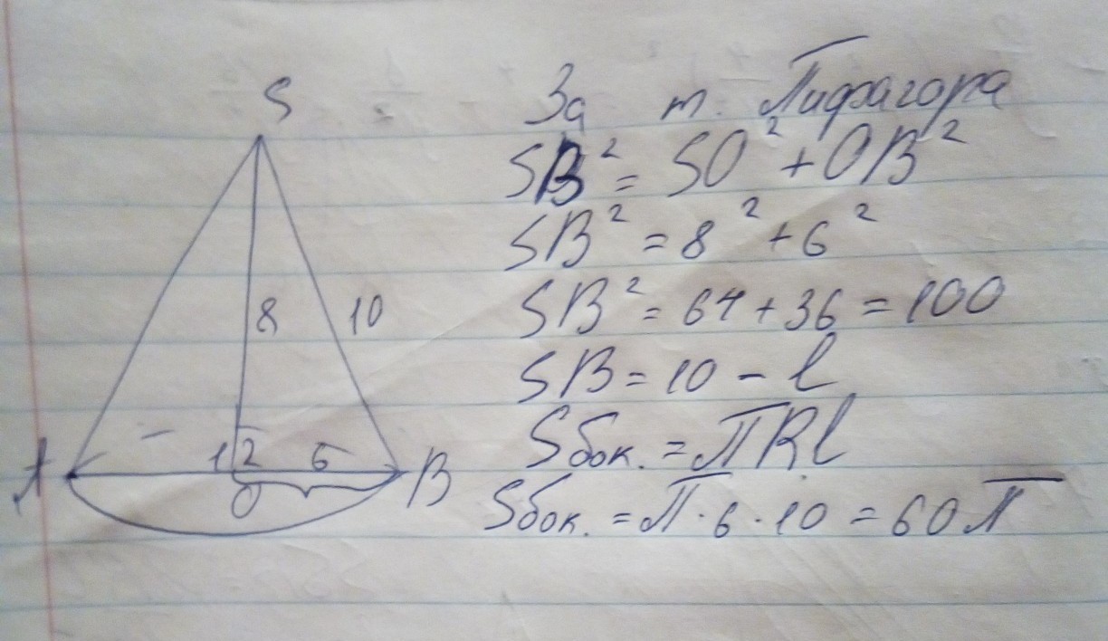 За теоремой Пифагора находишь SB потом подставляешь в формулу для Sбок.