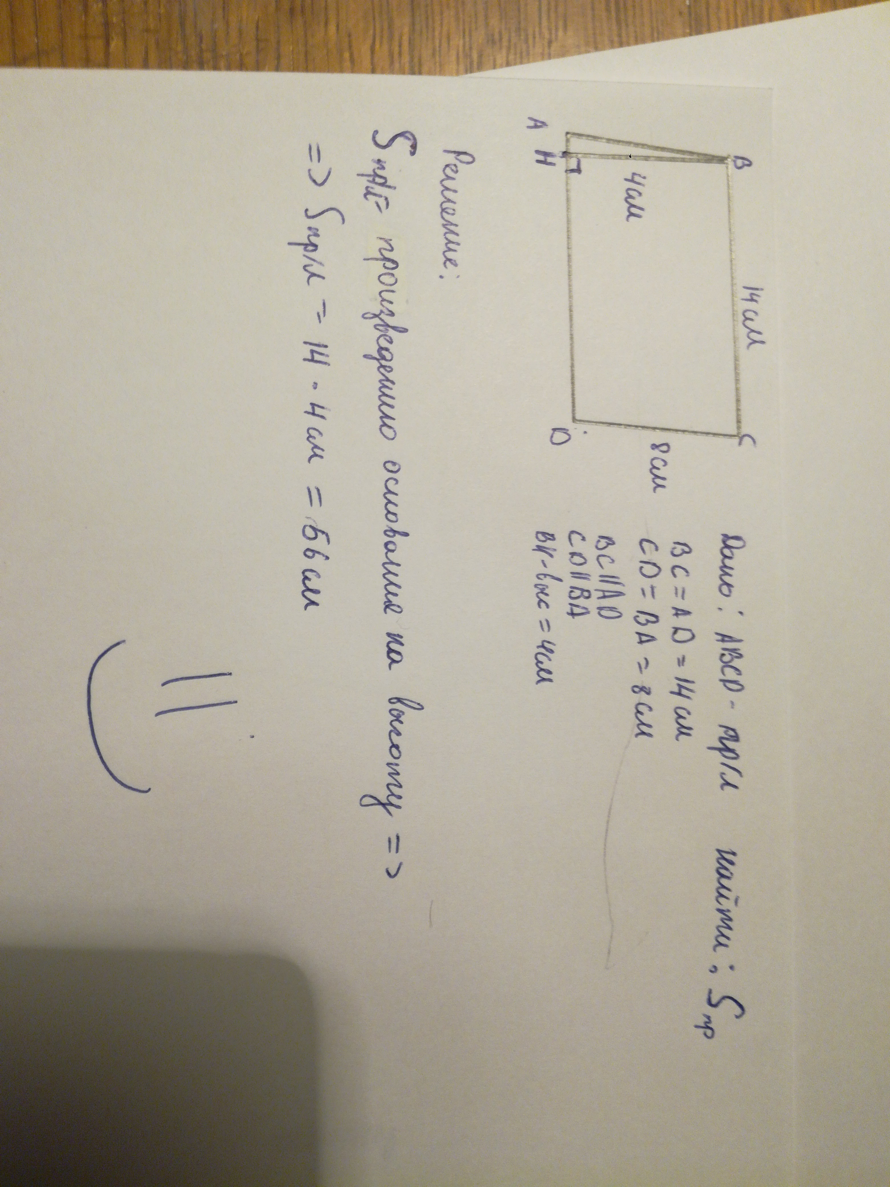 в параллелограмме abcd стороны равны 14 и 8 см высота проведённая к большей сторане равна 4 см найдите площадь параллелограмме и вторую высоту
