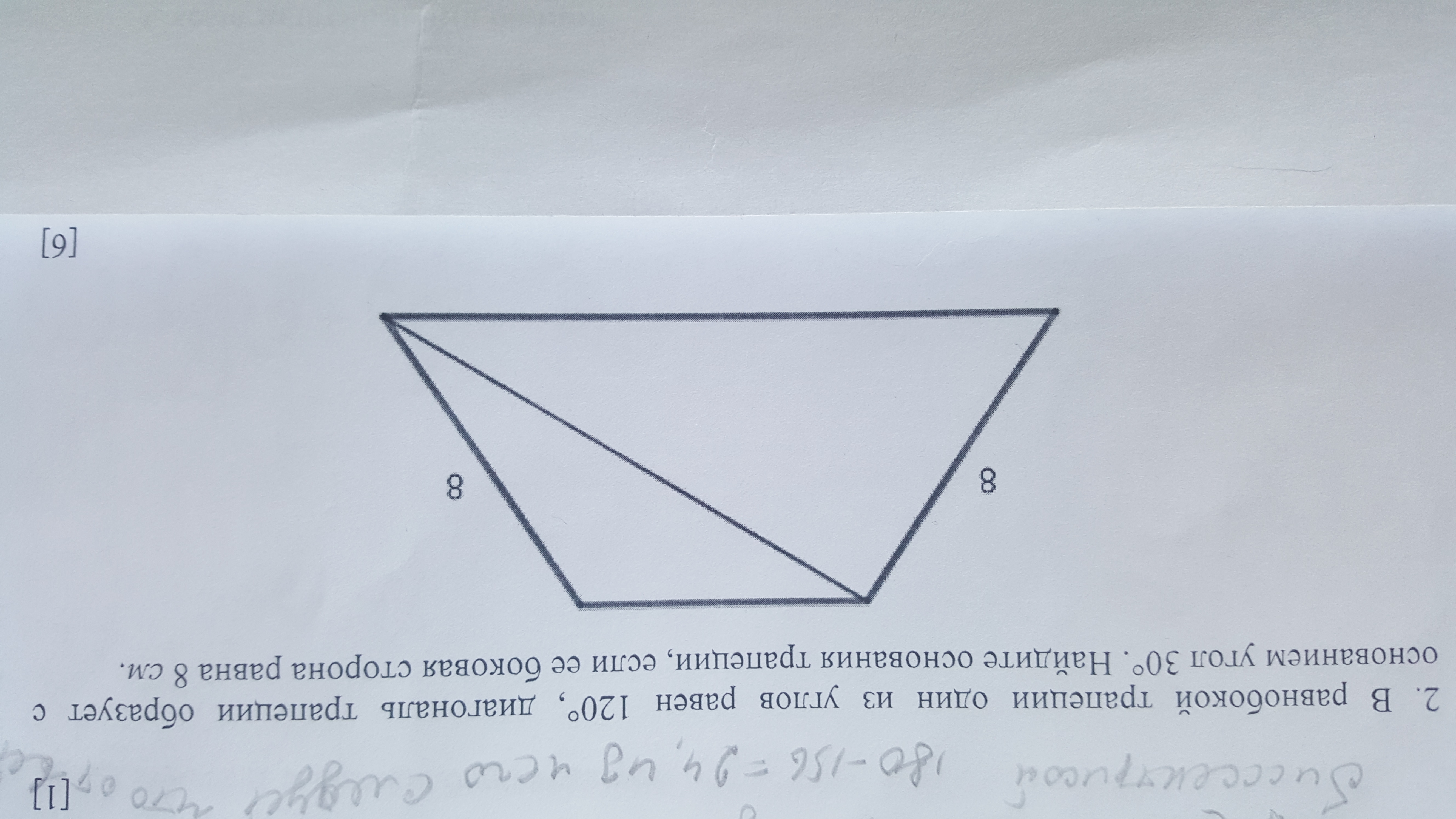 В равнобокой трапеции один из углов равен 120° , диагональ трапеции образует с основанием угол 30° . Найдите основания трапеции , если её боковая сторона равна 8 см.
